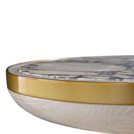 - Antique brass band adds a timeless touch of glamor, complementing the table’s luxurious materials