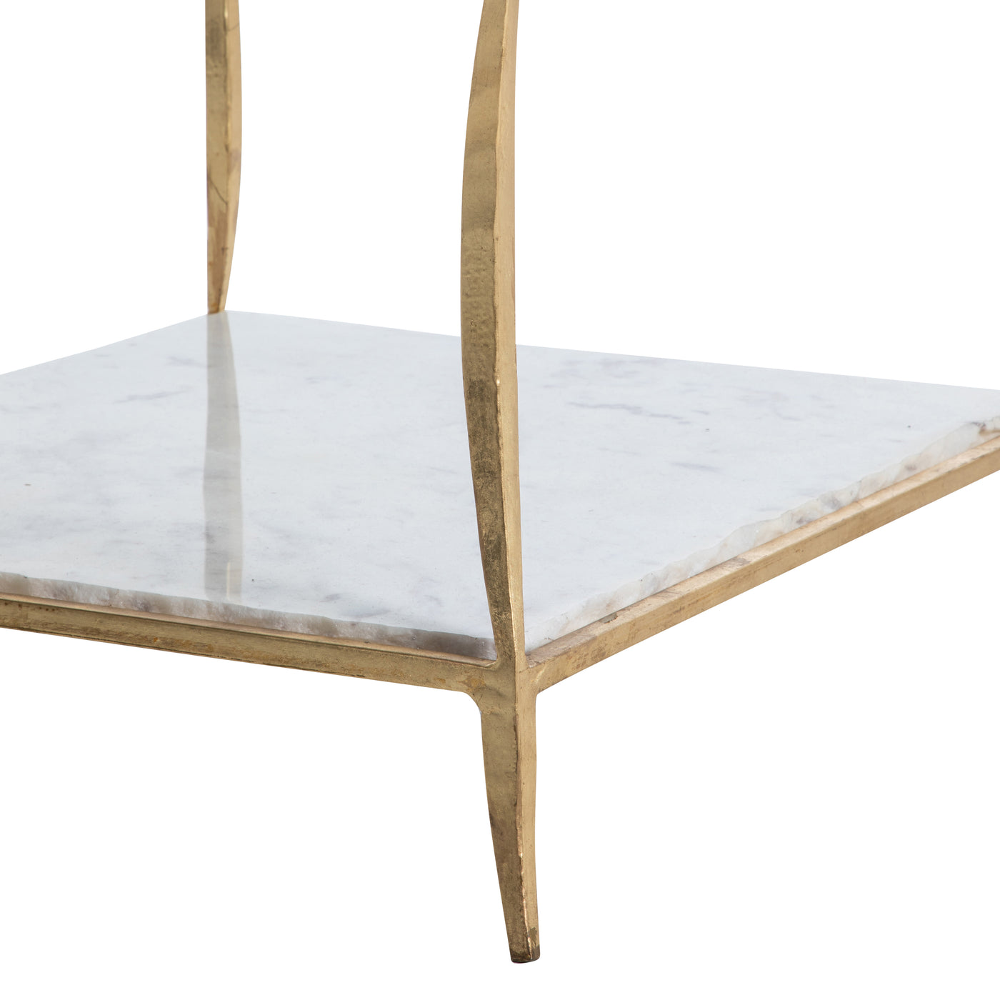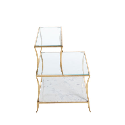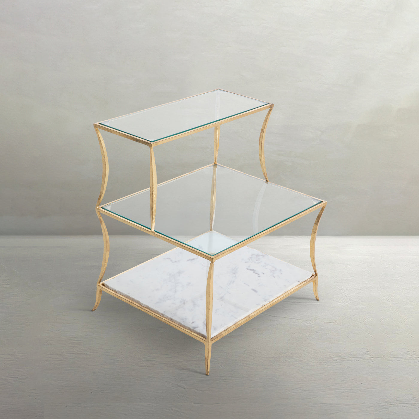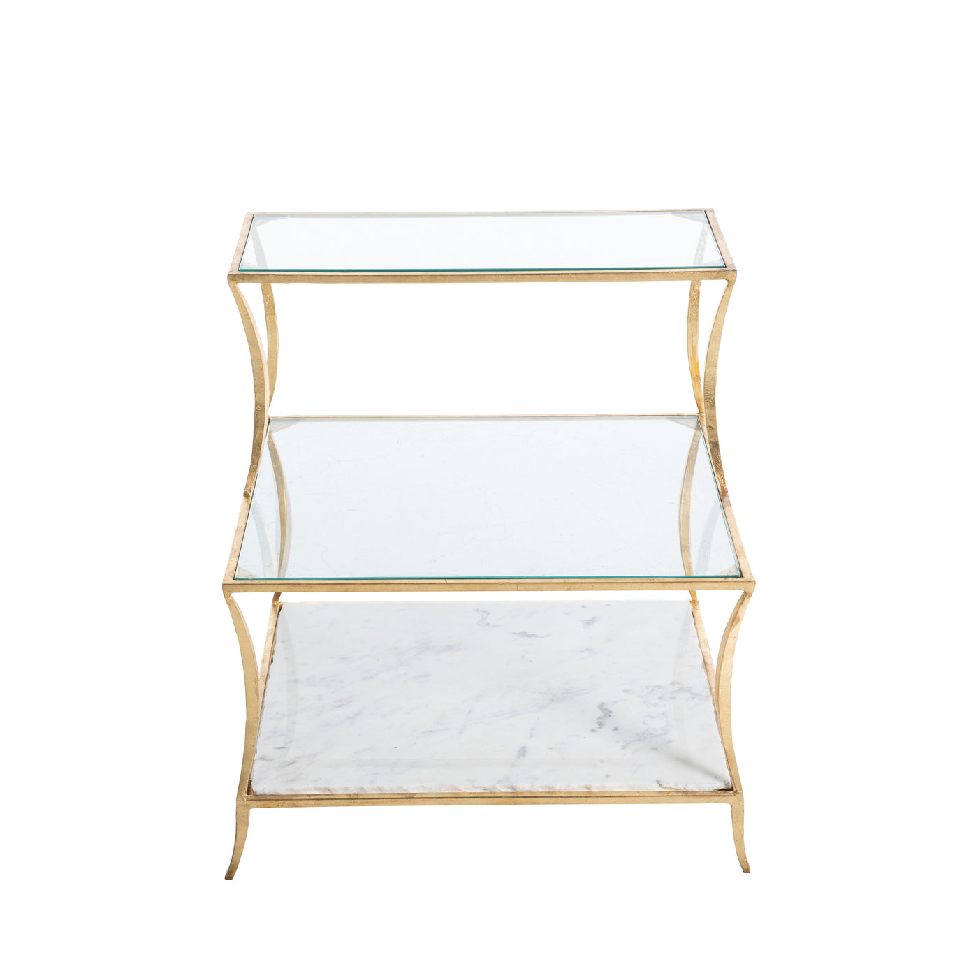 The Hirsch Side Table exudes sophistication with its Gold-Leafed iron frame and tempered glass shelves, designed in a multi-level structure that combines functional storage with open, airy design. The white marble bottom shelf anchors the piece, providing a stunning contrast to the lightness above, while the elegantly curved legs add a touch of grace to this versatile and stylish piece. Natural materials give this product its unique charm, with variations in color and pattern to be anticipated and celebrated.