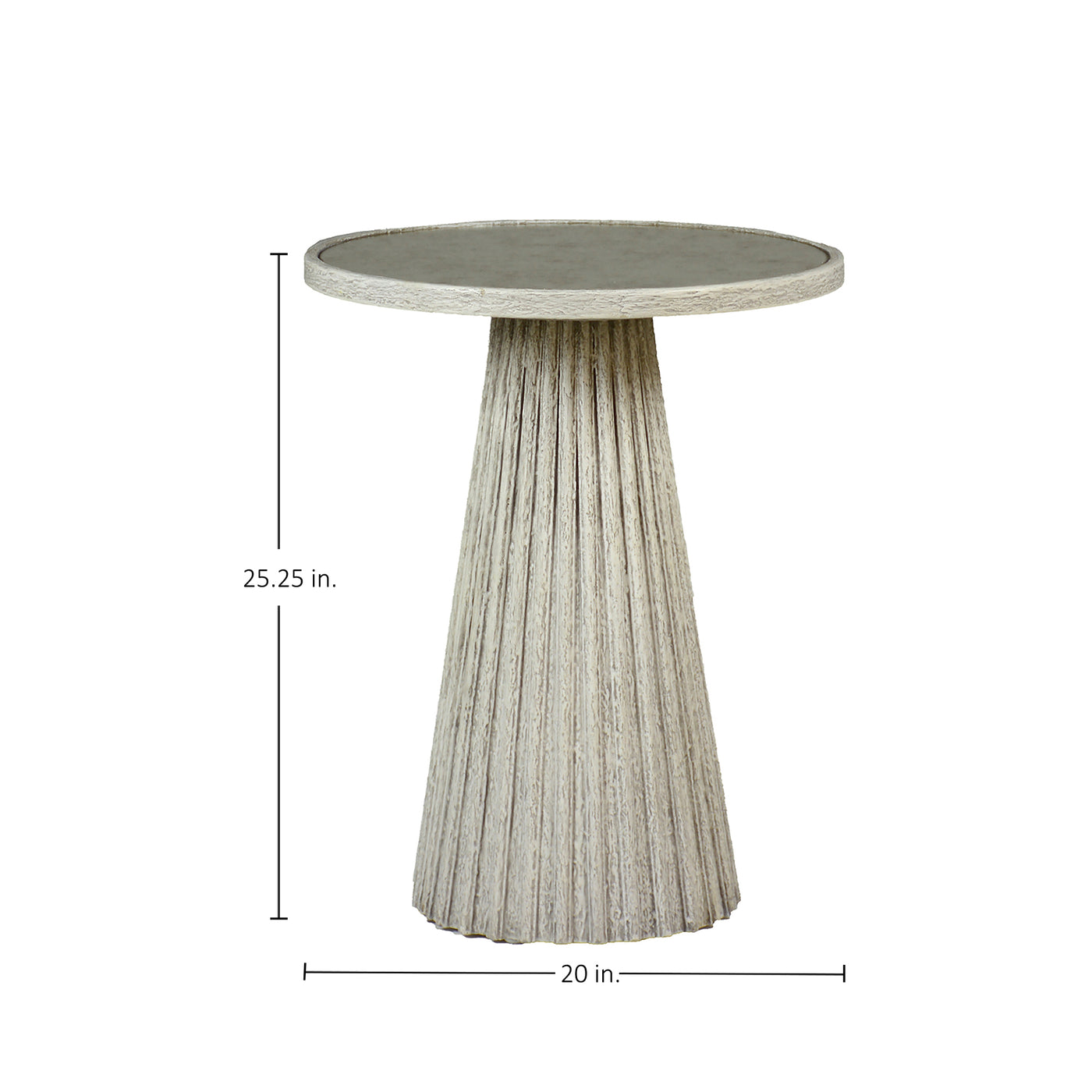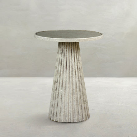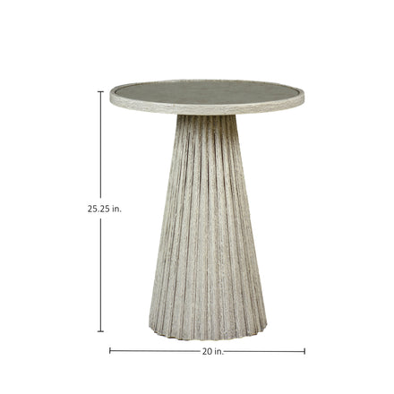 The Kingsley Side Table combines clean lines with a vintage aesthetic to create a versatile and rustic accent piece. Its textured ribbing and distressed antique white finish evoke a sense of timeless charm, while the round inset antique mirror top adds a touch of sophistication. Perfect for any living space, this tapered base side table effortlessly complements both traditional and contemporary décor, providing a stylish surface for your favorite decorative items or a convenient spot for your essentials.