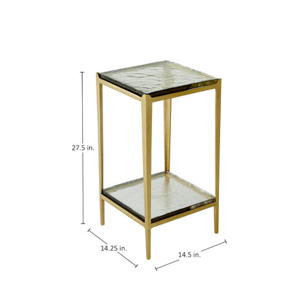 The Magnus Side Table is a stunning blend of modern design and luxurious materials. Featuring a sleek metal frame with a polished gold finish, this side table exudes sophistication. The table's top and lower shelf are made from beautifully textured and thick layer of cast glass, adding an elegant touch to its minimalist design. Perfect for displaying decorative items or keeping essentials within reach, the Magnus Side Table is a versatile and stylish addition to any living space, effortlessly enhancing the decor with its refined elegance.