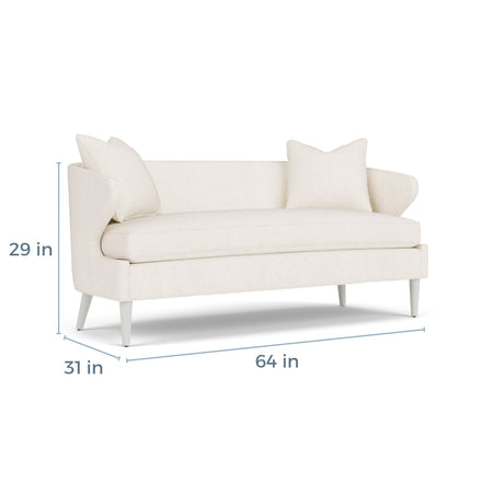 With its mid-century inspired rounded back, the Monroe Settee surrounds with comfort. A low back, smooth rounded arms, and sleek tapered legs give this settee its distinctive style that makes an appealing accent whether in a living room or bedroom setting. Nailhead trim and self welting along the seams add handsome and optional tailored detailing.