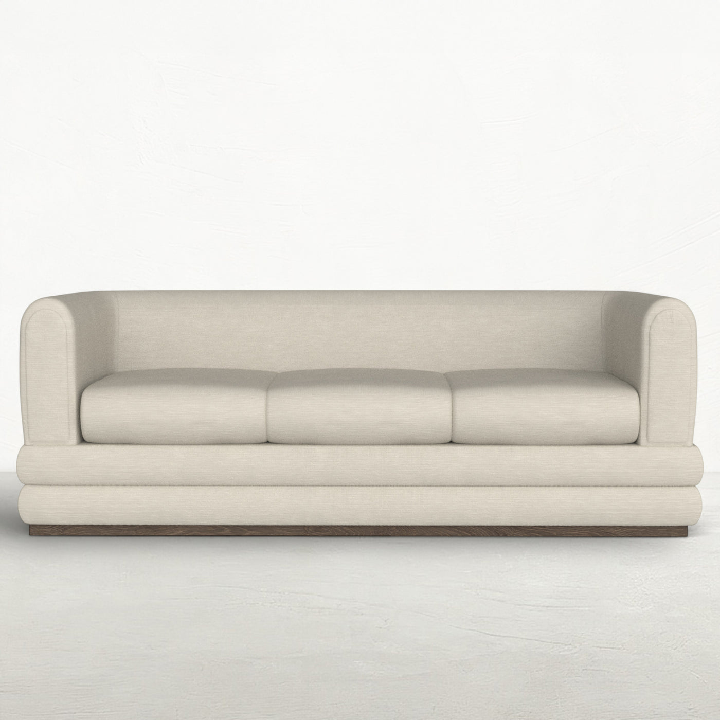 The Sorelle Sofa embodies refined modern tailoring and sculptural comfort. Its fully upholstered frame showcases tight, structured lines softened by plush, loose seat cushions for a relaxed yet sophisticated presence. The high curved arms transfer around the back, creating an elegant continuous silhouette. A channeled base detail adds textural interest and emphasizes the sofa’s grounded form, supported by a subtle plinth base. Available in a wide range of customizable fabrics, you can personalize the fabric to fit your interior style. Visit one of our retail stores for even more fabric options.