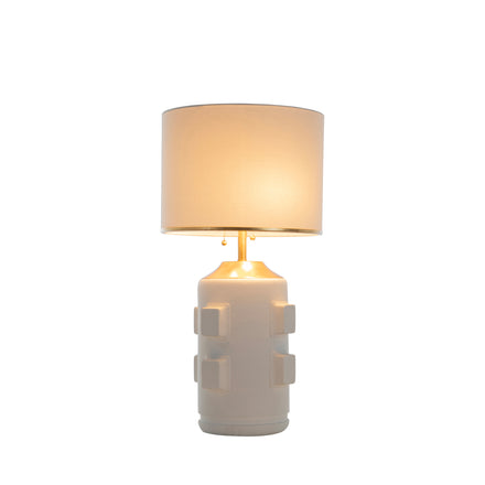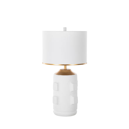 The Bridget Table Lamp captures the essence of mid-century modern design, reflecting a moment of daring experimentation with shapes. Its crisp white base, adorned with geometric detailing, is beautifully complemented by a vintage gold finish at the top. This striking composition is crowned with a feather white linen shade, perfectly proportioned to the lamp's bold silhouette. The Bridget Table Lamp adds a touch of retro sophistication to any space, blending seamlessly with both contemporary and classic decor.