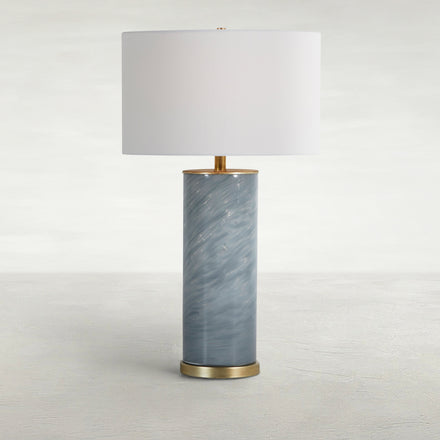 The Ellington Table Lamp is a elevated transitional piece, featuring a large column of gray and clear swirled glass accented with a champagne finish. Its stunning glass body beautifully catches and reflects sunlight, creating a mesmerizing display of light and color throughout the room. Each glass lamp is uniquely handmade, ensuring slight variations that add to its distinctive character. This elegant lamp brings a touch of refined sophistication to any room with its one-of-a-kind base and sea salt linen shade.