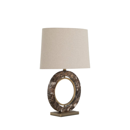 The Janelle Table Lamp - Marble, is a finish extension of our best-selling Janelle Table Lamp in Alabaster. The Janelle Lamp exudes sophistication with its honed marble ring encircling a matte antique brass center ring. Topped with a classic white linen oval shade, this lamp provides a soft and elegant glow, perfect for living rooms, bedrooms, or study areas. The harmony between the earth toned marble and warm brass creates a visually appealing piece that adds a touch of luxury to any decor. Its timeless design ensures that the Janelle Table Lamp will be a cherished addition to your home, offering both style and functionality.