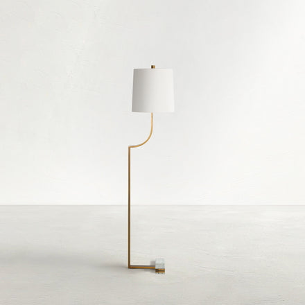 The Jayden Floor Lamp offers a unique solution for task lighting with its innovative C-shaped design, allowing it to slip over the arm of a chair or sofa to provide direct light exactly where it's needed. Crafted with an antique brass finish, this lamp features a crystal bar counterweight for stability and style. Its elegant curvature and practical functionality make it a perfect addition to living rooms, reading nooks, or study areas. The Jayden Floor Lamp not only illuminates your space but also adds a touch of classic elegance with its timeless design and quality craftsmanship.
