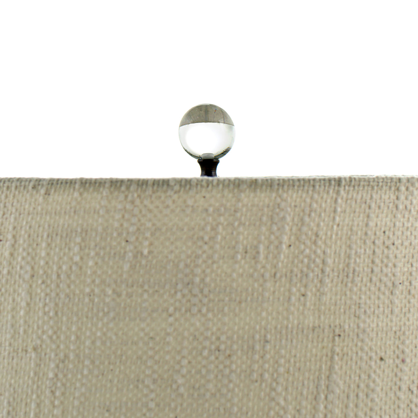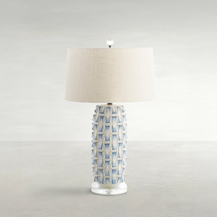 The Kelly Table Lamp is a coastal-inspired beauty, featuring an eye-catching pattern of blue and white ceramic that brings a fresh and vibrant aesthetic. The textured cream linen shade diffuses light softly, creating a warm and inviting atmosphere. The burnished bronze accents add a touch of vintage charm while the clear crystal topper, making this lamp a versatile piece that complements both traditional and modern interiors. Perfect for bedside tables, living room consoles, or study desks, the Kelly Table Lamp enhances your d?cor with its unique style and quality craftsmanship.