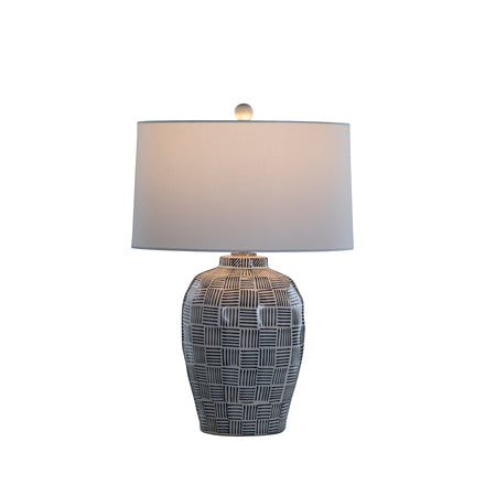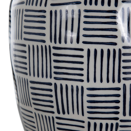 - Hand-painted ceramic base with a crosshatch pattern offers artisanal charm and unique visual texture