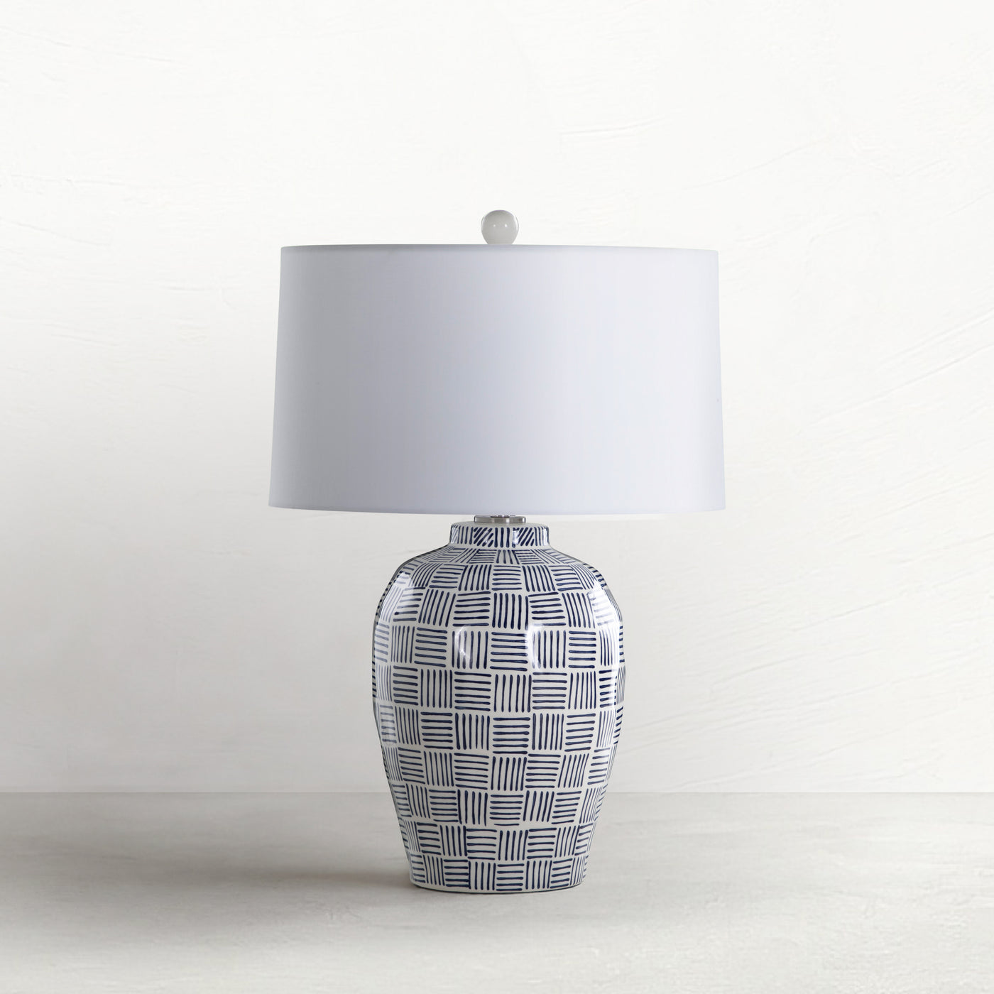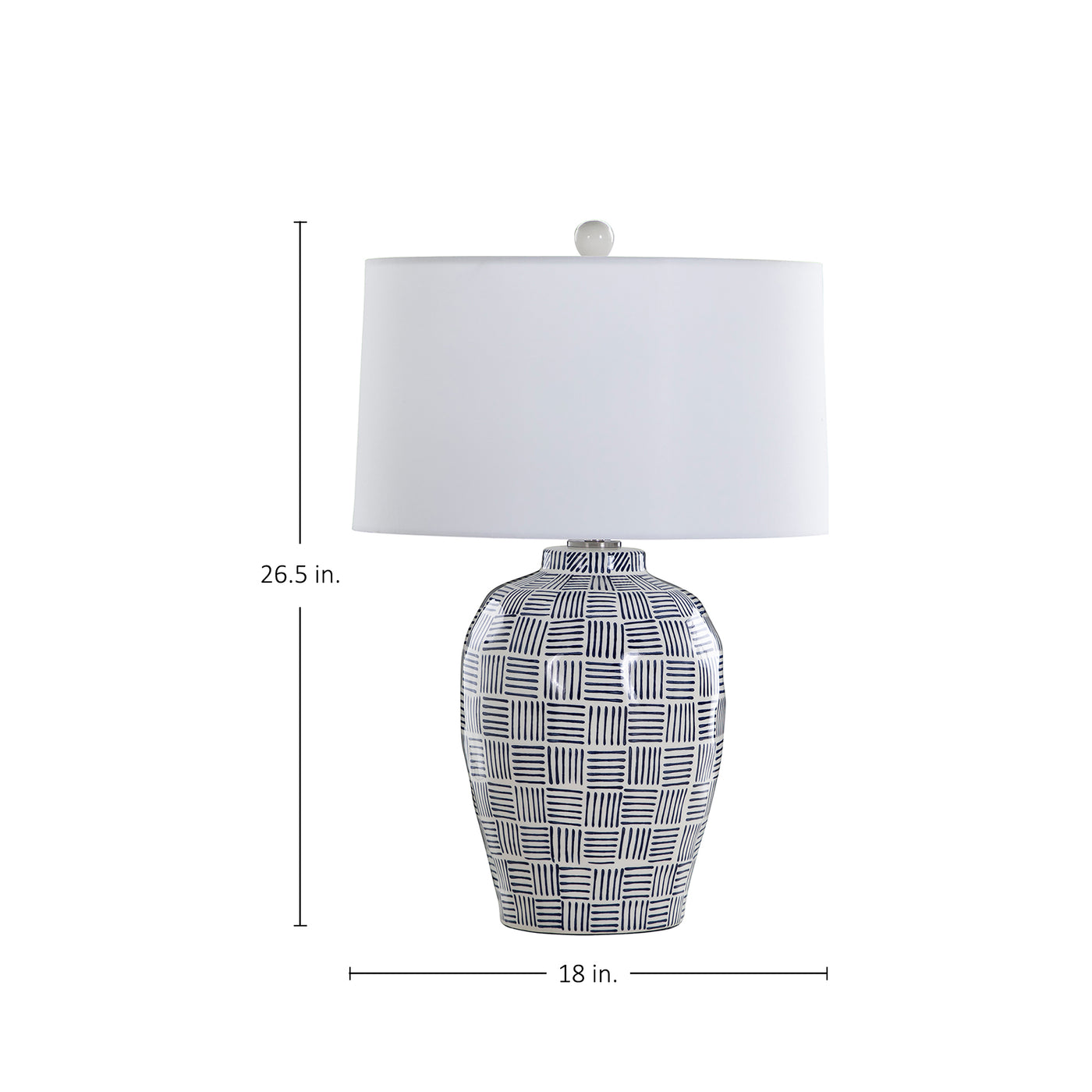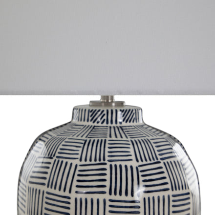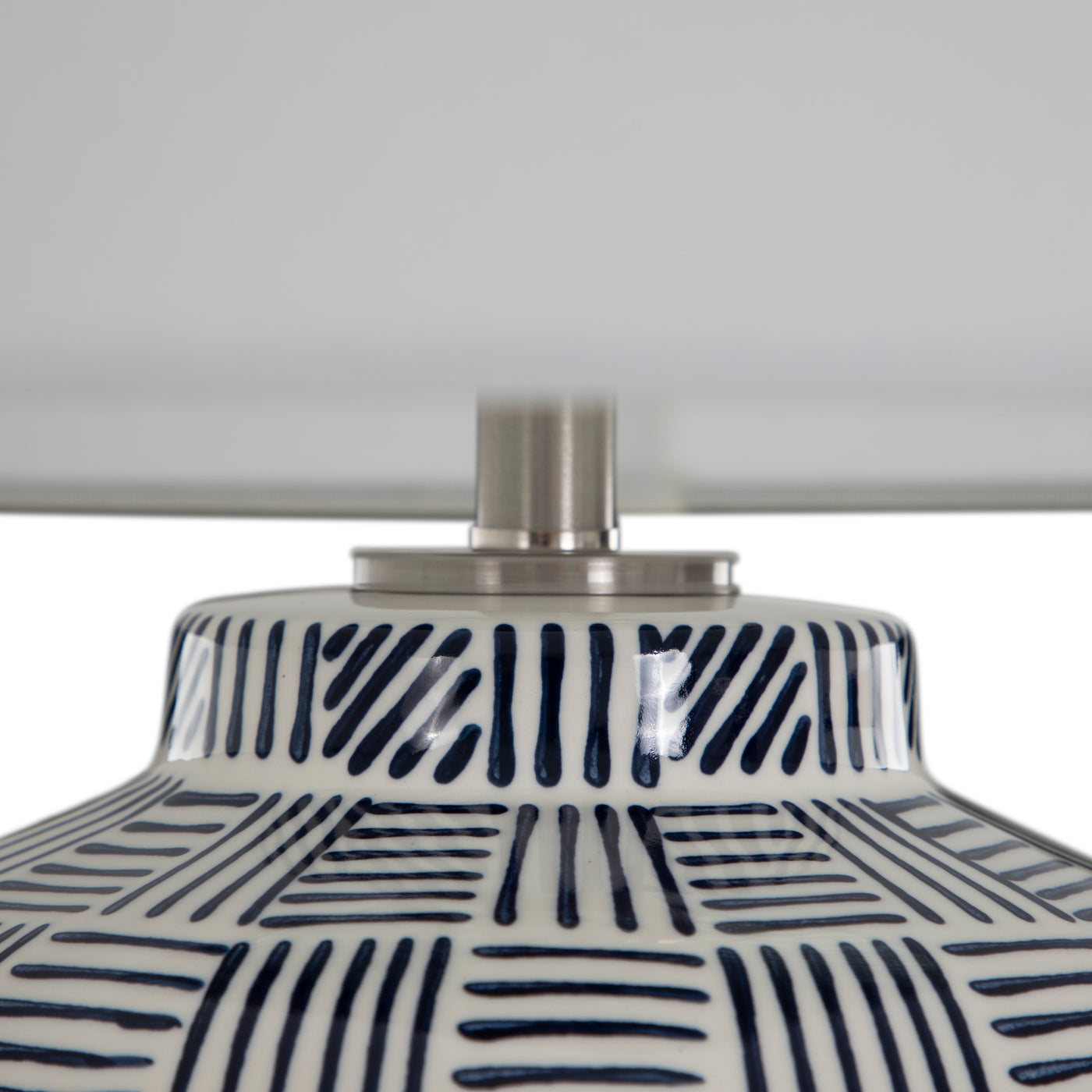 The Liora Table Lamp - Blue boasts a hand-painted ceramic crosshatch pattern in a timeless navy blue and white color scheme. Each brush stroke is thoughtfully placed, making no two exactly the same. Featuring a neutral brushed nickel metal harp, white linen shade, and white ceramic finial, this piece will blend well in any style room.