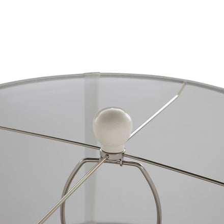 - Brushed nickel harp provides a subtle metallic accent that complements the ceramic body