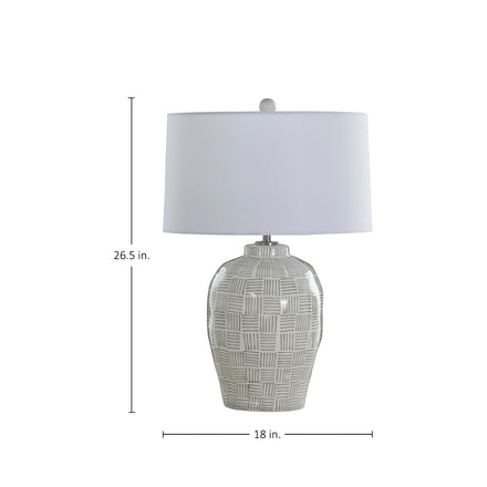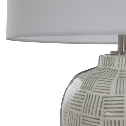 The Liora Table Lamp - Green boasts a hand-painted ceramic crosshatch pattern in a timeless sage green and white color scheme. Each brush stroke is thoughtfully placed, making no two exactly the same. Featuring a neutral brushed nickel metal harp, white linen shade, and white ceramic finial, this piece will blend well in any style room.