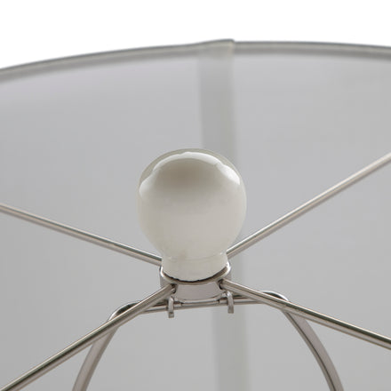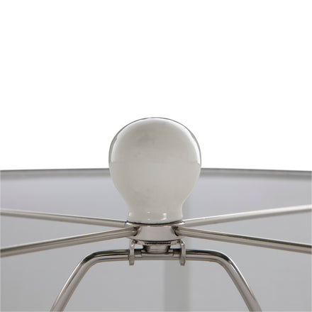 - Brushed nickel metal harp adds a neutral, refined contrast to the softly textured ceramic body