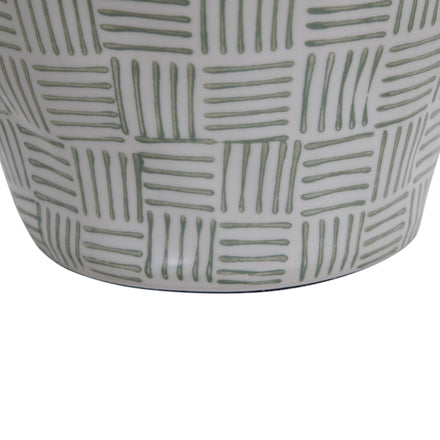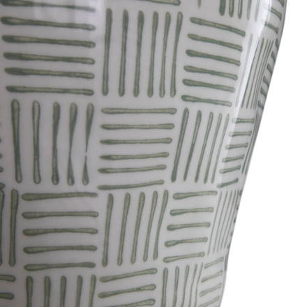 - Hand-painted ceramic base with sage green and white crosshatch pattern offers artisanal charm and one-of-a-kind character