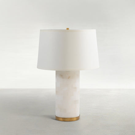 - Large round tiled alabaster base offers a natural, luminous look with inherent variations that make each lamp one-of-a-kind