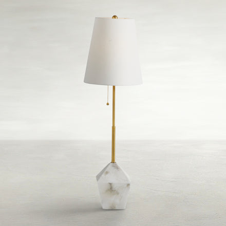 The Perry Table Lamp embodies simple, clean design with its slim profile and clean white linen shade. Perfect for small spaces, this console lamp features a stained gold toned metal detail at the bottom of the shade, complementing its solid alabaster base. The natural beauty of the alabaster and the sleek, minimalist styling make this lamp a versatile addition to any decor. Whether placed on a console, side table, or desk, the Perry Table Lamp adds a touch of elegance and functionality to your home, enhancing the ambiance with its refined and understated charm.