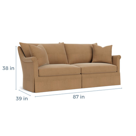 The Devin Falls sofa embodies a timeless, traditionally-inspired silhouette with a high back and elevated arms for refined aesthetics and supreme comfort. It features English rolled arms with delicate pleating and elegant piping, blending classic design with minimalist sensibility. A skirted frame conceals the feet, adding to its elegant appearance and offering additional benefits. Each sofa is custom-made in North Carolina, ensuring a unique piece that effortlessly enhances any living space.