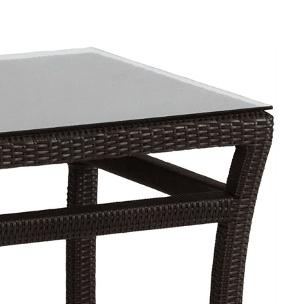 The Club Woven End Table features timeless outdoor wicker styling crafted from highly durable and weather-resistant N-dura resin wickerguaranteed to not experience any significant color change for 5 years. A sturdy wrought aluminum base and glass top surface make this accent table a perfect fit in a variety of outdoor furnishing settings.