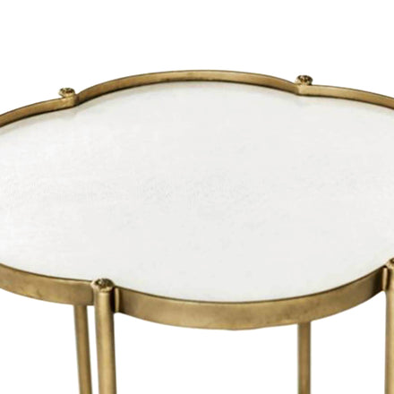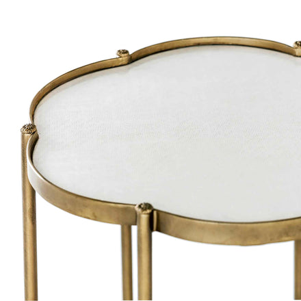 The Clementine Flower Table brings a touch of elegance to any space with its small charming petal silhouette. Encased in brushed brass, the table's faux white seagrass surface adds a sophisticated contrast. Petite floral caps provide a hint of antique detailing, making this chic and playful design a standout piece in any transitional decor. Great for smaller spaces in need of a side table.