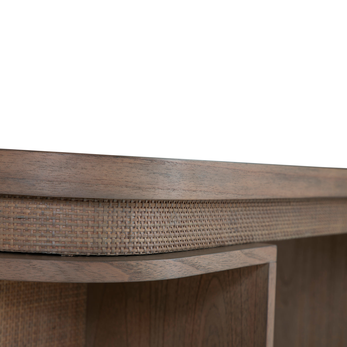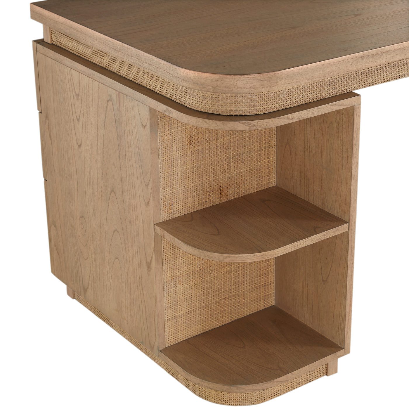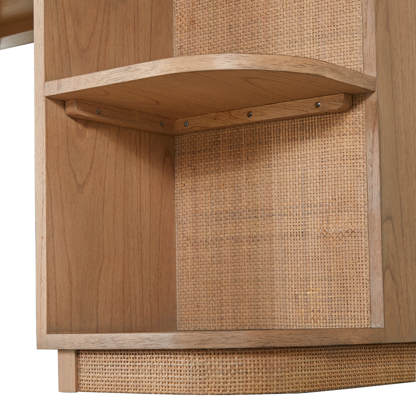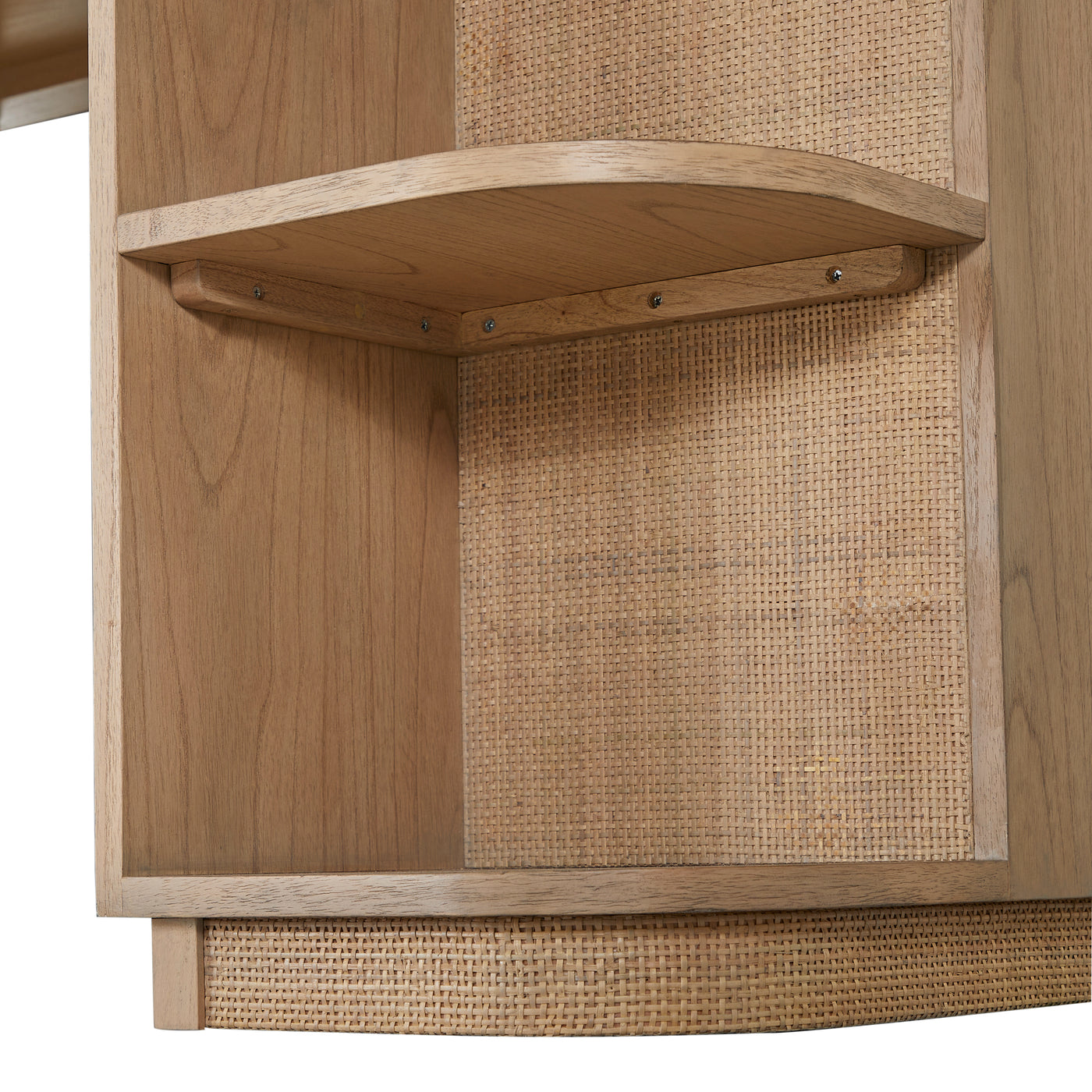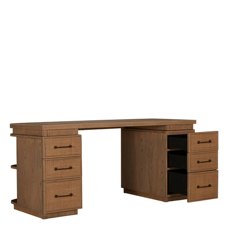 The Elsa Desk blends natural materials with timeless craftsmanship to create a workspace that's as stylish as it is functional. Handcrafted from Blonde Natural Mindi Wood Veneer, it features accents of natural rattan and antique bronze hardware, giving it a warm, organic look with a touch of vintage charm. With soft-close drawers and thoughtfully integrated storage, the Elsa Desk brings both beauty and practicality to your home or office.