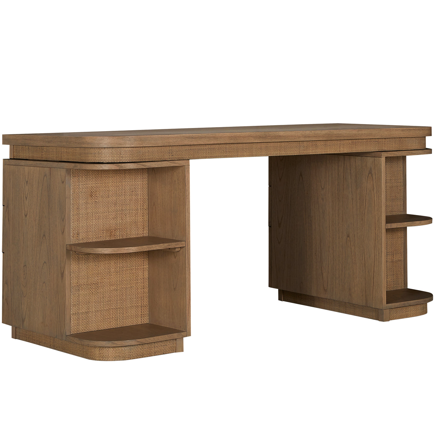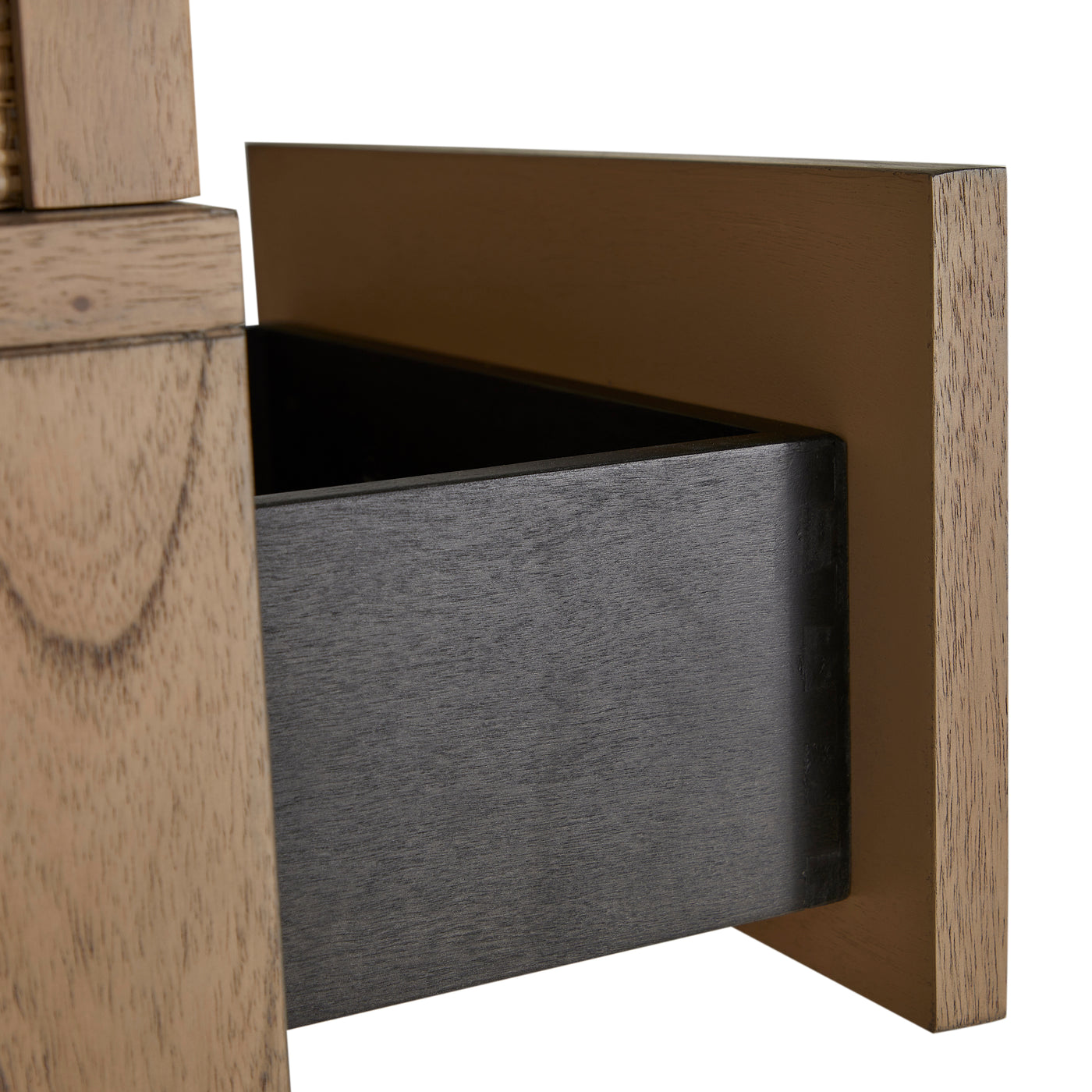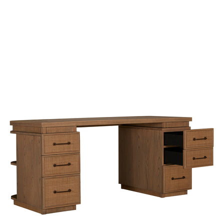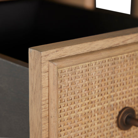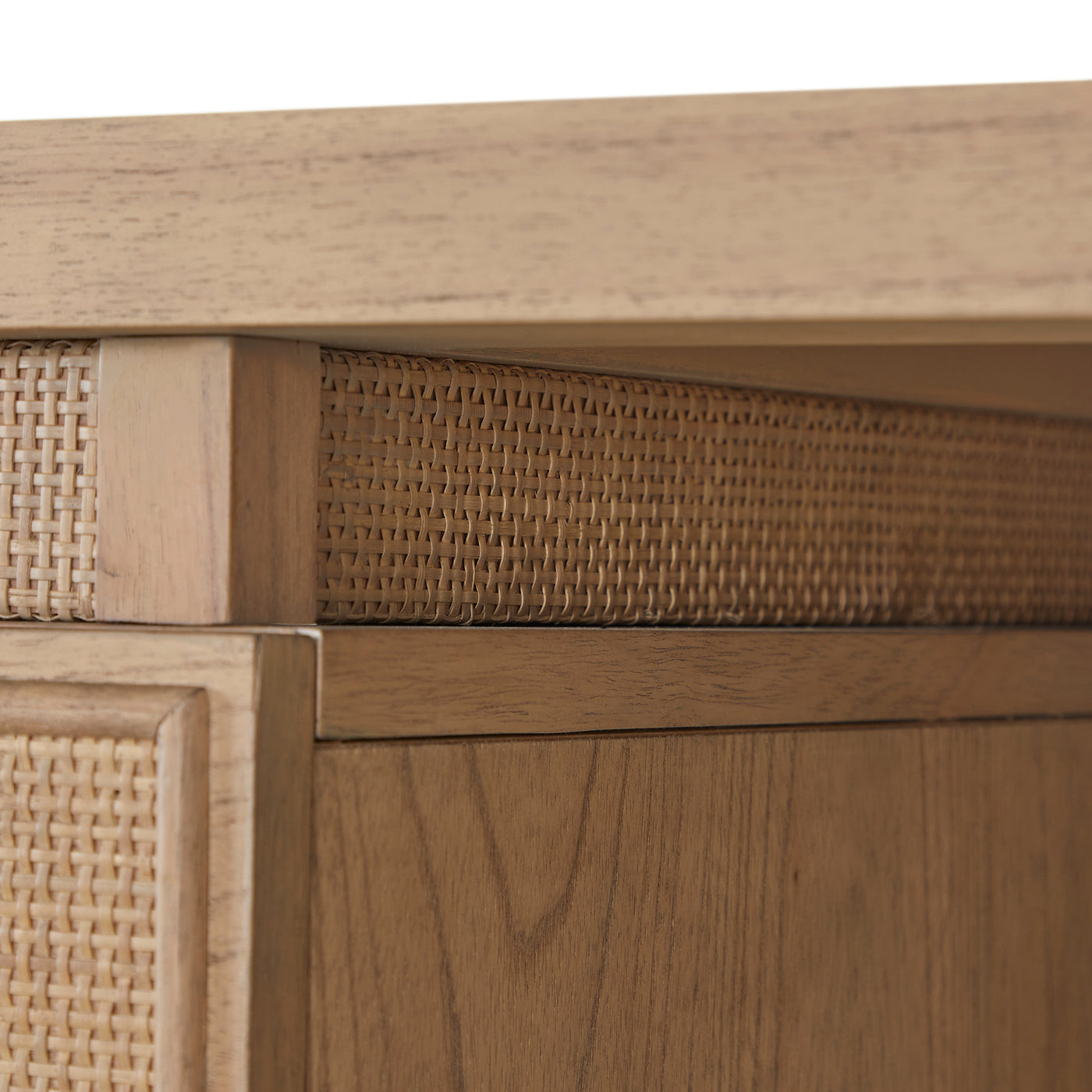 The Elsa Desk blends natural materials with timeless craftsmanship to create a workspace that's as stylish as it is functional. Handcrafted from Blonde Natural Mindi Wood Veneer, it features accents of natural rattan and antique bronze hardware, giving it a warm, organic look with a touch of vintage charm. With soft-close drawers and thoughtfully integrated storage, the Elsa Desk brings both beauty and practicality to your home or office.