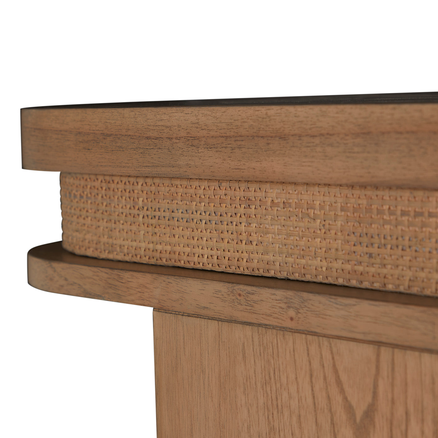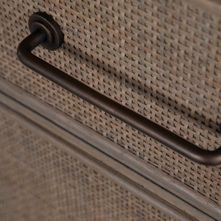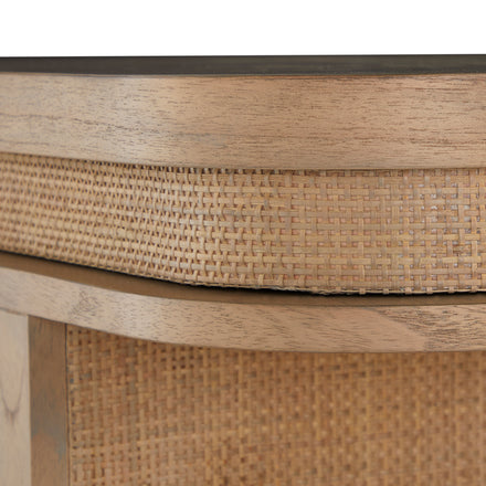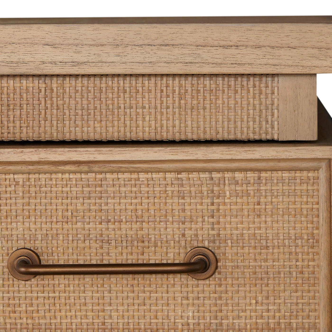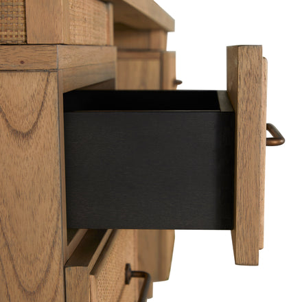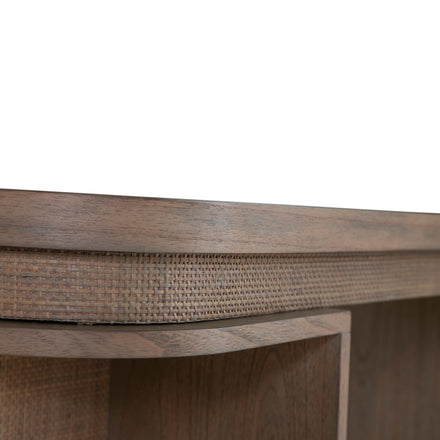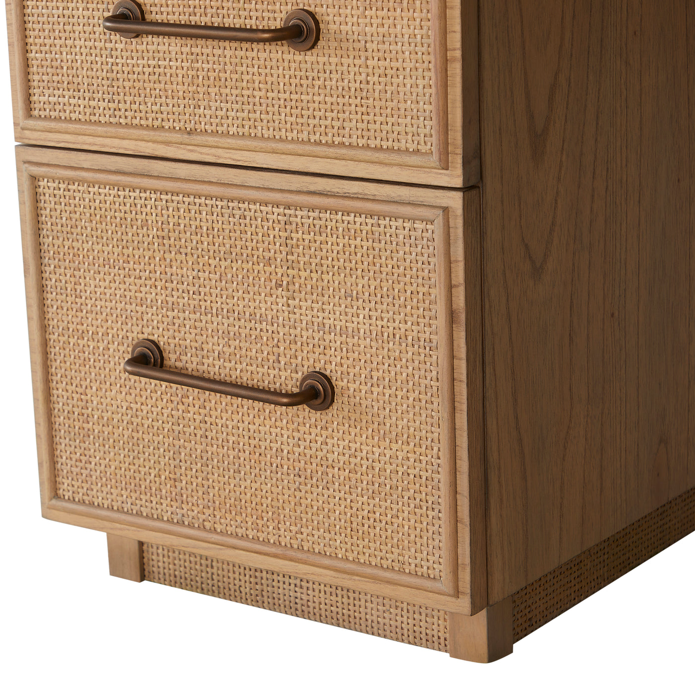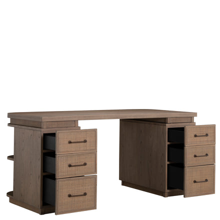 The Elsa Desk blends natural materials with timeless craftsmanship to create a workspace that's as stylish as it is functional. Handcrafted from Blonde Natural Mindi Wood Veneer, it features accents of natural rattan and antique bronze hardware, giving it a warm, organic look with a touch of vintage charm. With soft-close drawers and thoughtfully integrated storage, the Elsa Desk brings both beauty and practicality to your home or office.