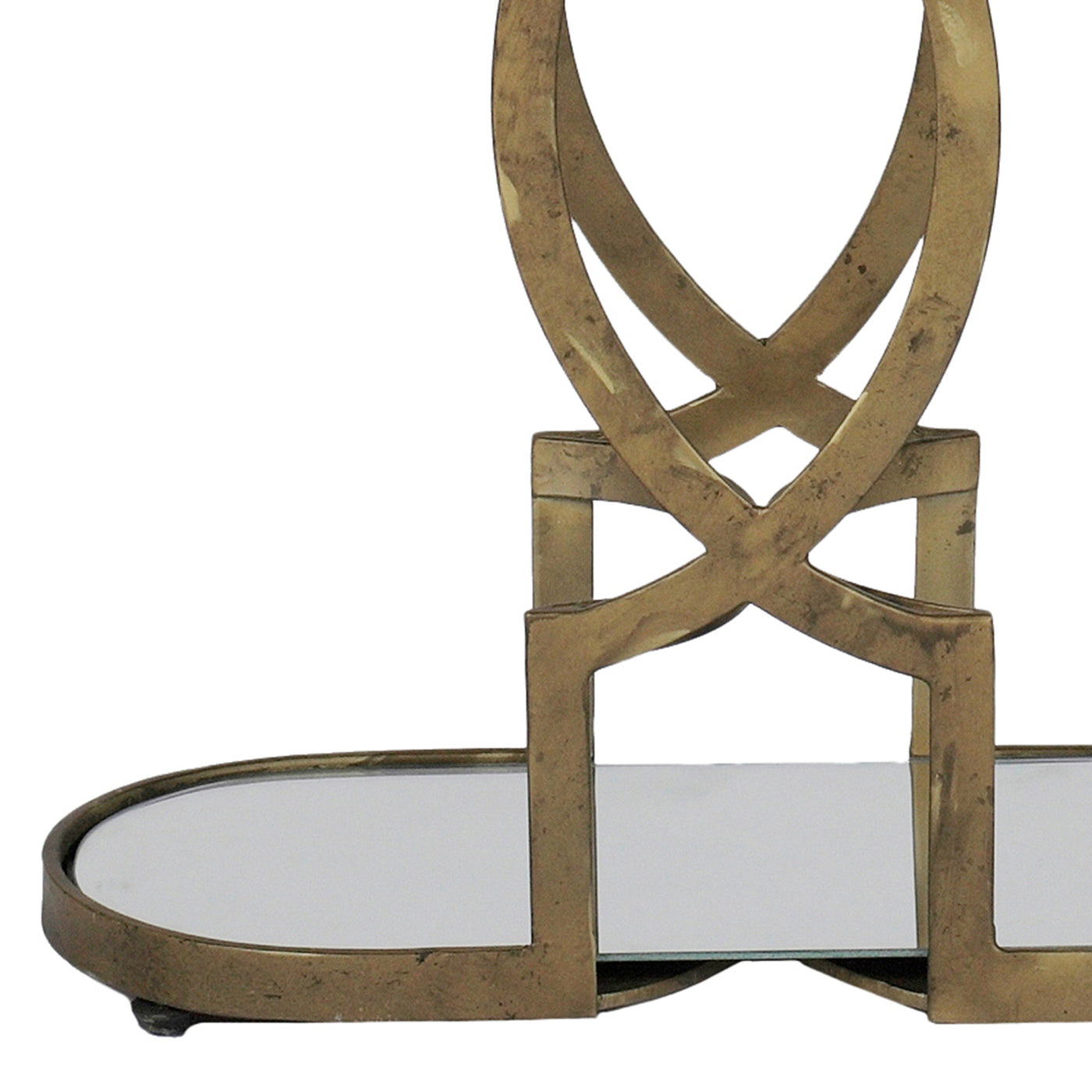 - Cut mirrored top and shelf inset in a narrow iron frame with an antique brass finish for a refined, elegant look