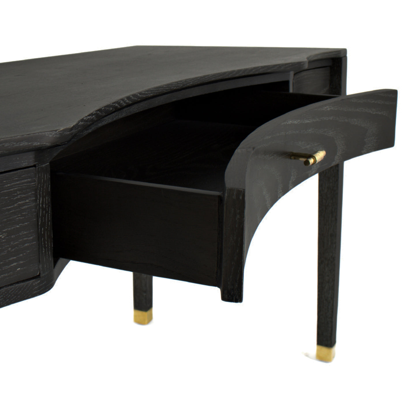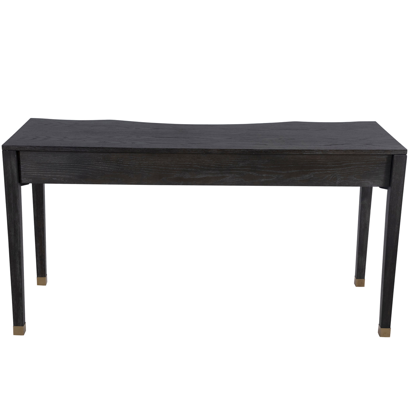 The Nathan Desk features a scalloped front and unique hammered hardware on three drawers, creating a stunning and modern workspace. Its elegant combination of dark Gray cerused oak and stainless gold makes this desk a standout piece in any home office or study area. The Nathan Desk provides ample storage and a spacious work surface, ensuring both style and functionality. Enhance your productivity and décor with this beautifully designed desk that offers a perfect blend of elegance and practicality.