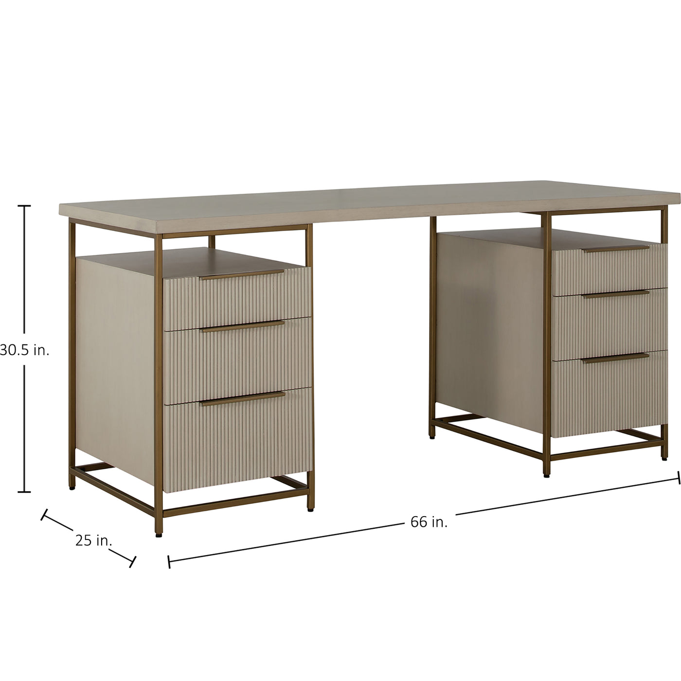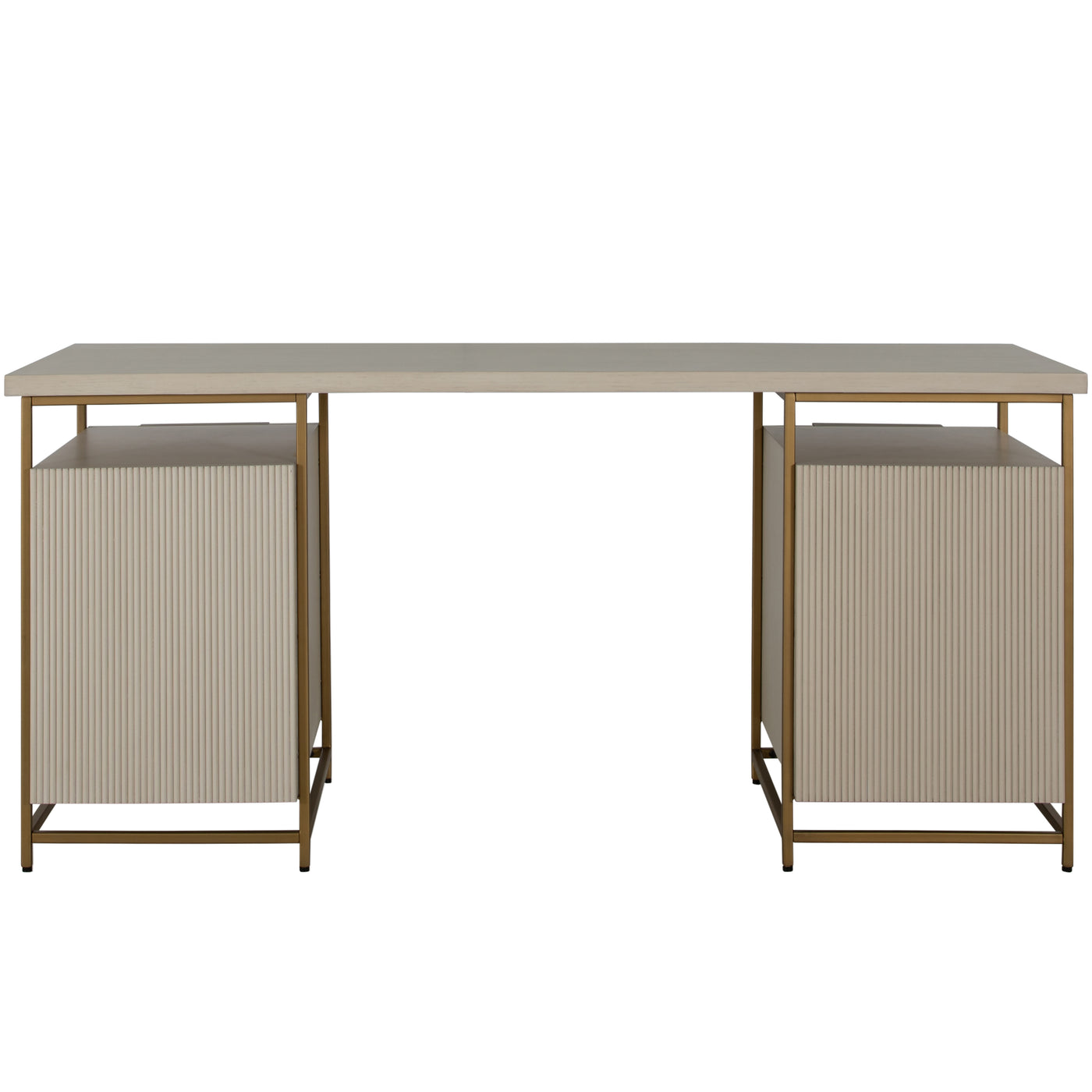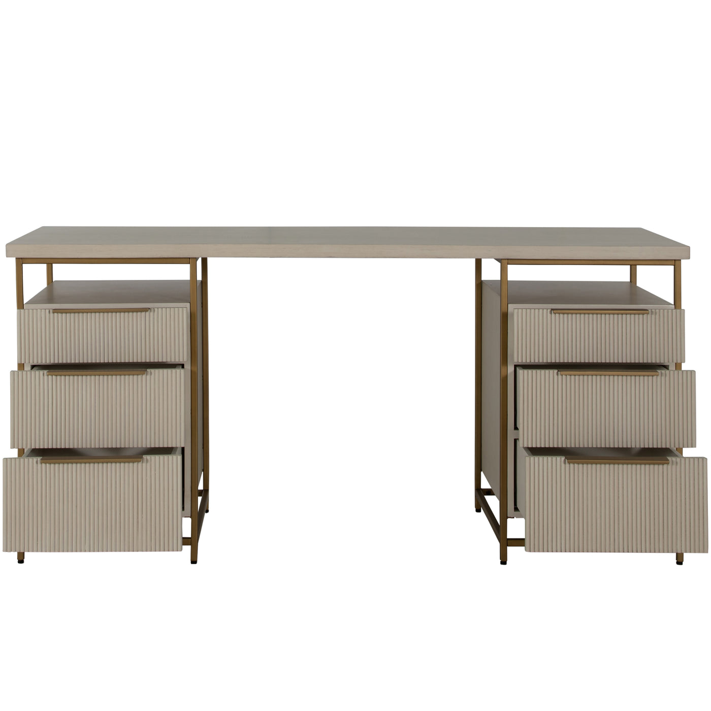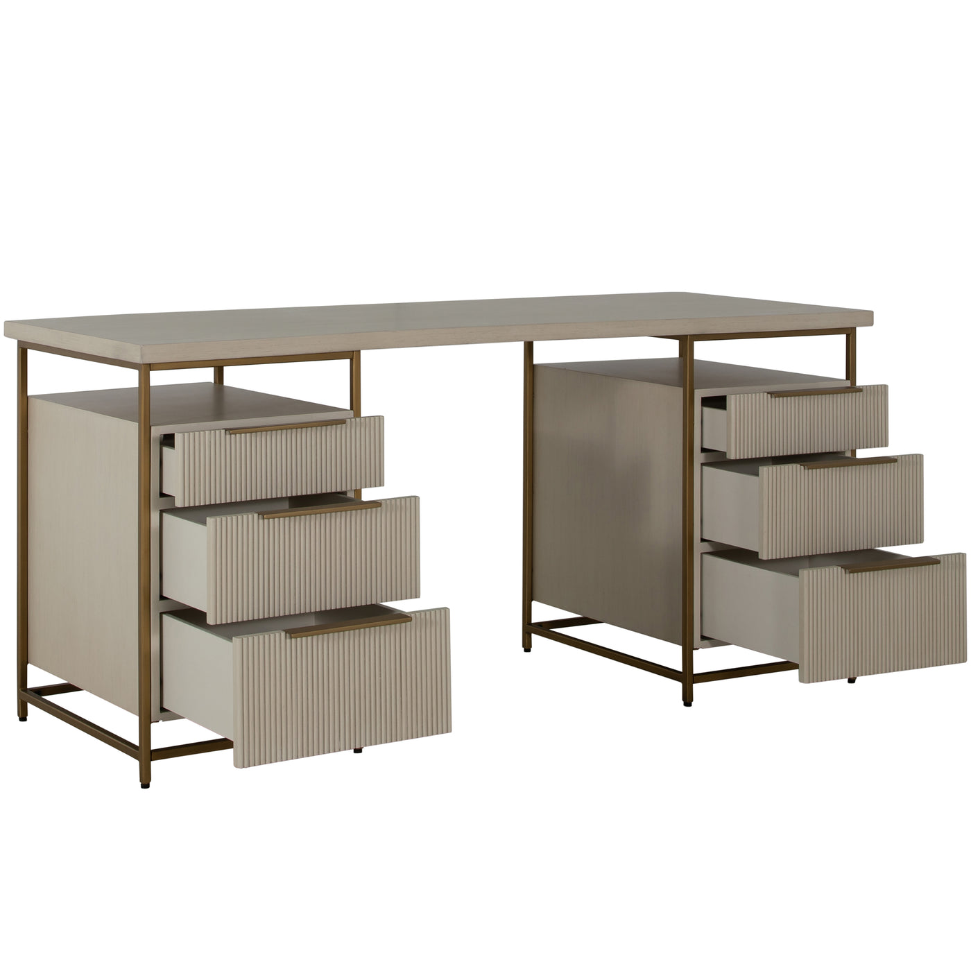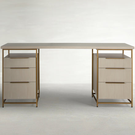 The Rowen Desk, inspired by the Riggs Nightstand, is designed for office spaces with a focus on functionality and ample storage. It features three enclosed fluted pull-out drawers and an open surface on each side, providing extensive storage options without compromising on design. The combination of brass details with a sesame white finish gives the desk an elevated and sophisticated appearance. Despite its generous storage capacity, the desk maintains a light and airy feel, making it an ideal choice for those seeking a blend of practicality, style, and spaciousness in their workspace.