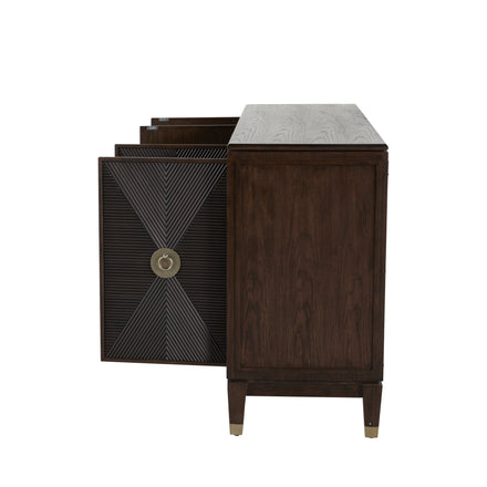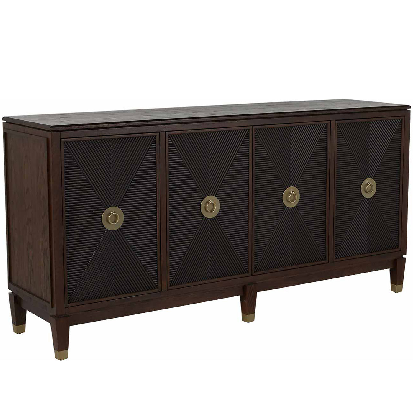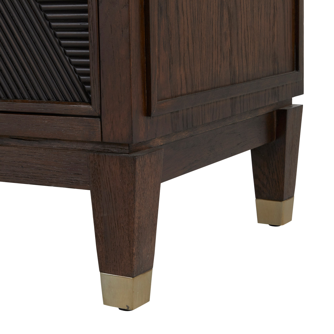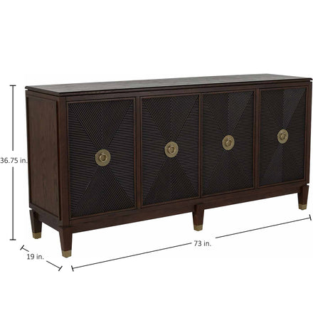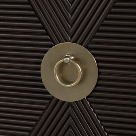 The Saffron Cabinet stands as a paragon of transitional design, masterfully bridging classic elegance with contemporary flair. At first glance, the cabinet's rich Tuscan brown finish and ribbed door texturing invite a unique texture, hinting at meticulous craftsmanship. The converging lines across the facade, accented by champagne-toned ring pulls, add a geometric dynamism that captures the eye and stimulates interest. Whether housing fine dinnerware or acting as the central hub for your multimedia, the Strella provides both functionality and a touch of luxury, making it an invaluable addition to your décor collection.