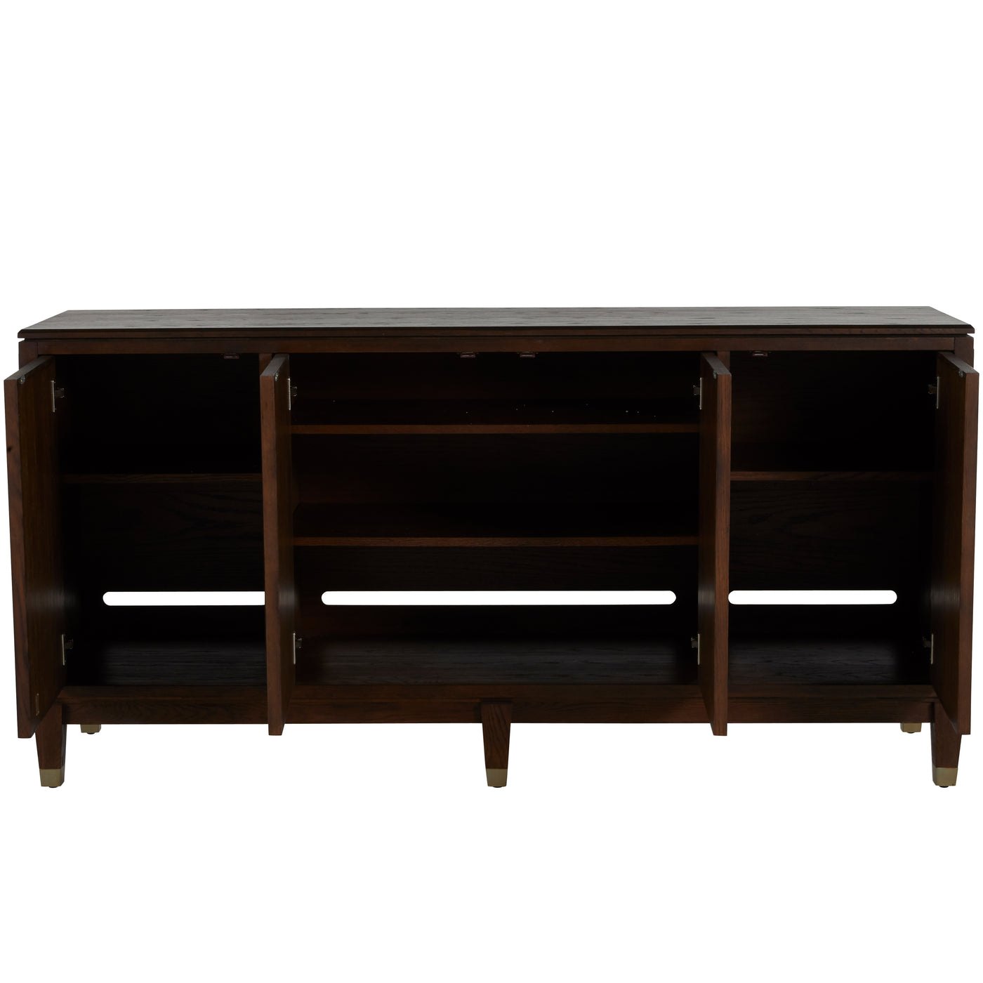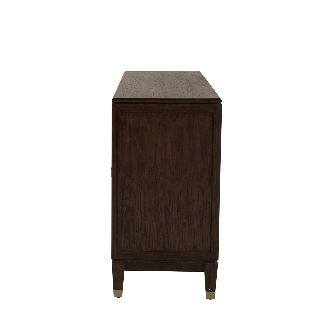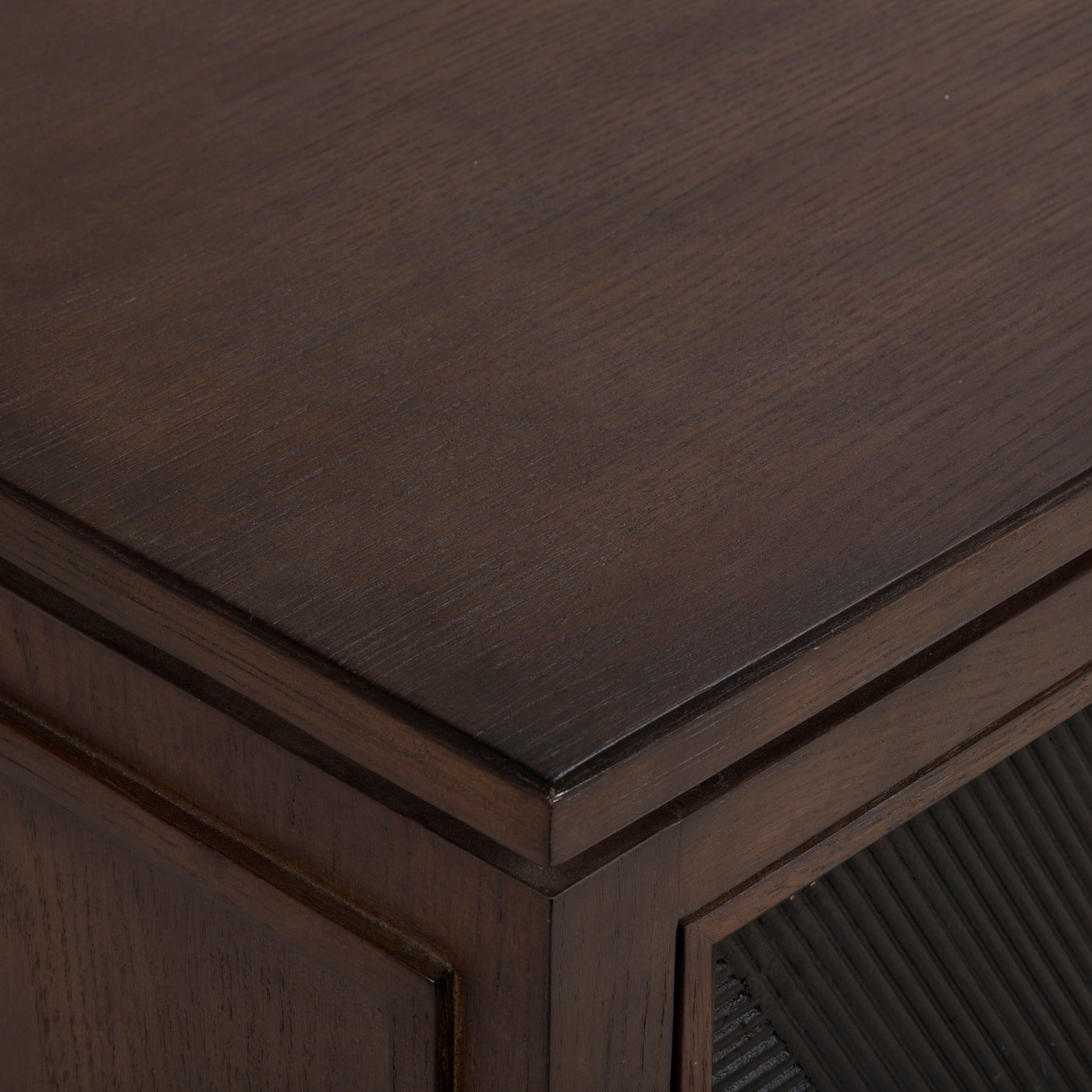 The Saffron Cabinet stands as a paragon of transitional design, masterfully bridging classic elegance with contemporary flair. At first glance, the cabinet's rich Tuscan brown finish and ribbed door texturing invite a unique texture, hinting at meticulous craftsmanship. The converging lines across the facade, accented by champagne-toned ring pulls, add a geometric dynamism that captures the eye and stimulates interest. Whether housing fine dinnerware or acting as the central hub for your multimedia, the Strella provides both functionality and a touch of luxury, making it an invaluable addition to your décor collection.