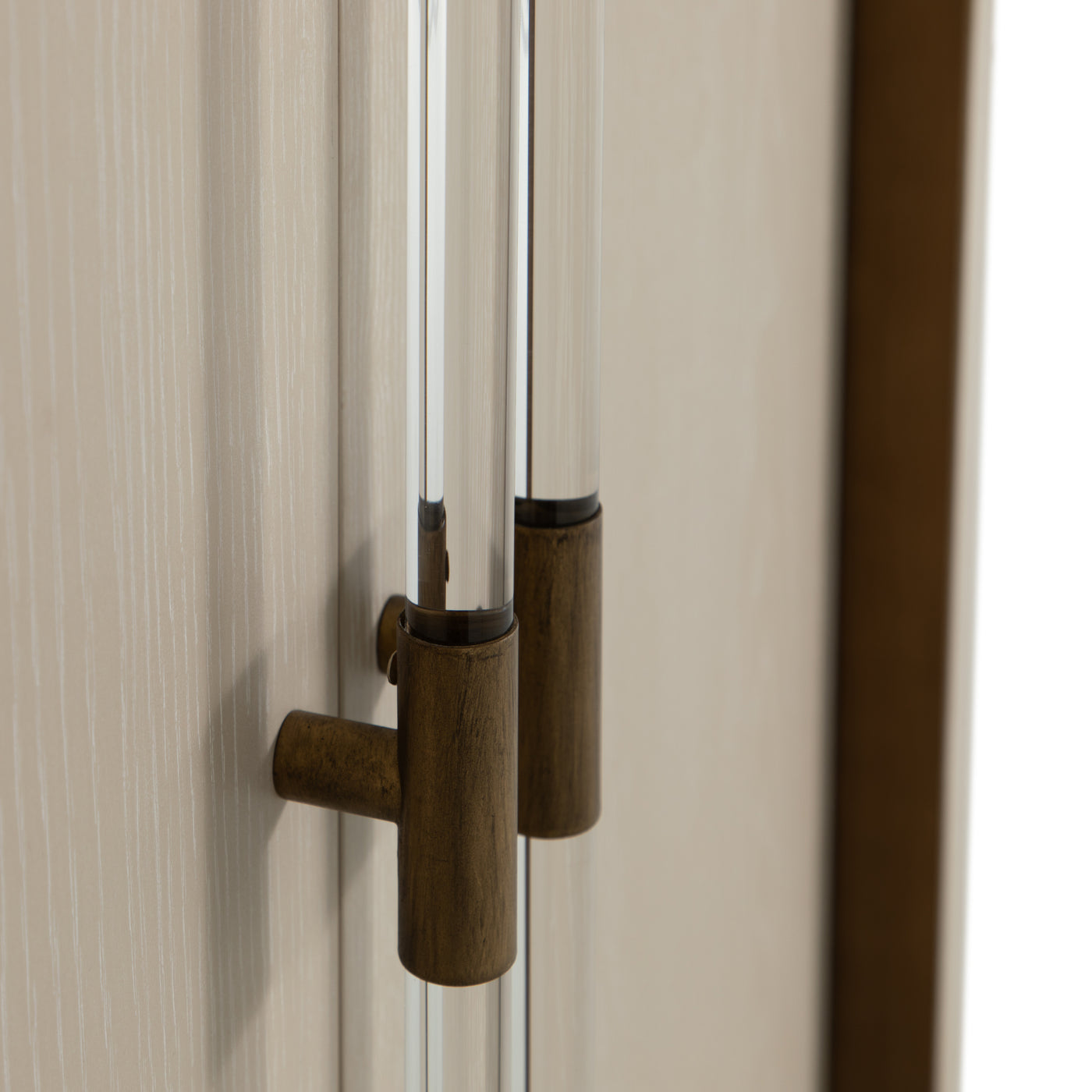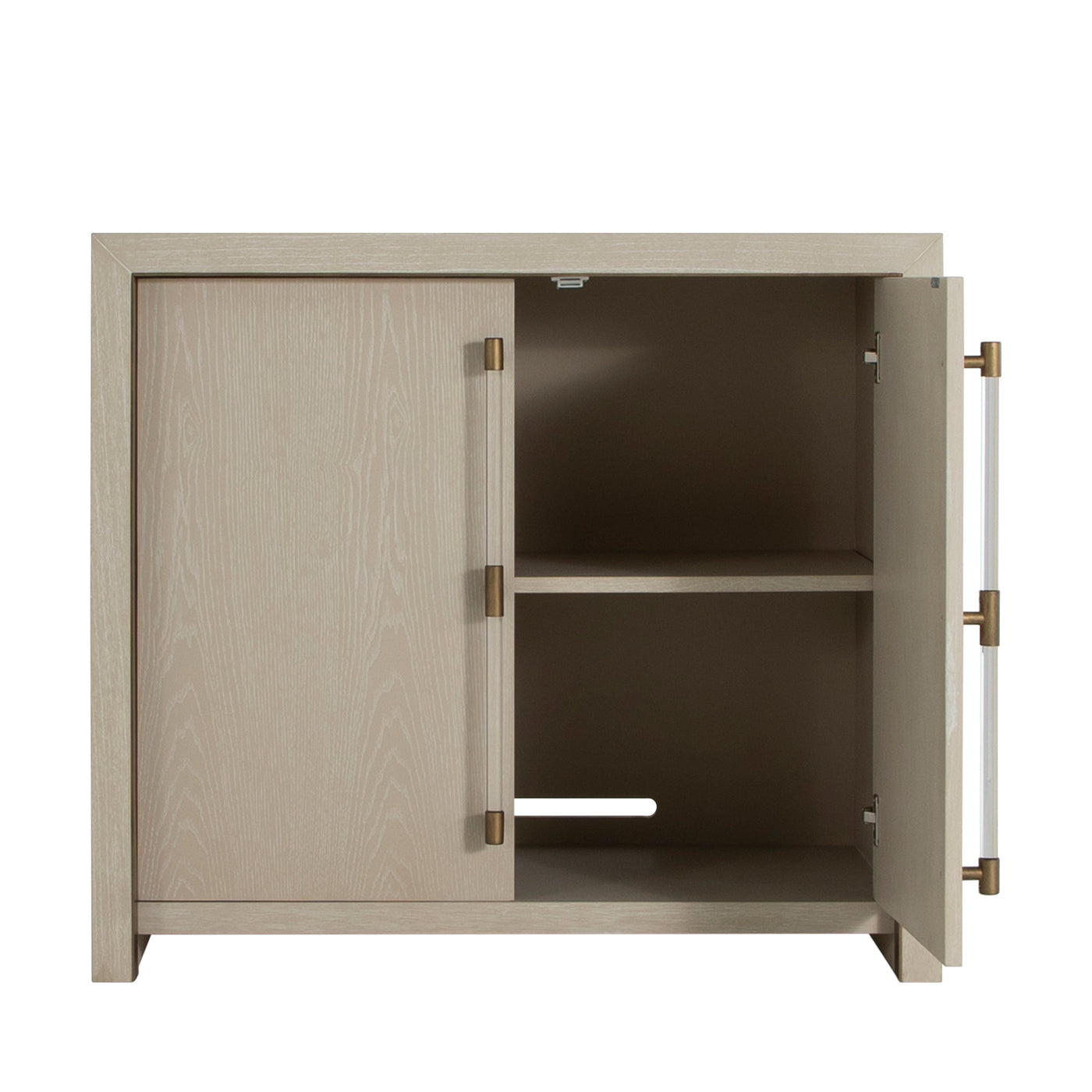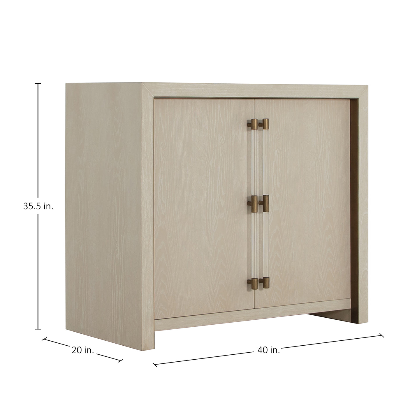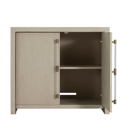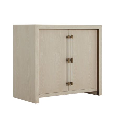 The Winford Accent Cabinet is a perfect blend of contemporary design and luxurious detailing. Crafted from oak veneer with stained gold accents, its cerused white finish highlights the natural wood grain, adding texture and depth. The cabinet's modern waterfall silhouette is accentuated by acrylic handles with gold-stained metal detailing. Whether used for elegant storage or as a chic media center, the Winford cabinet embodies Gabby's expertise in transitional style, effortlessly complementing both modern and traditional interiors. The rich combination of tactile wood, sleek acrylic, and warm metal elements make this piece a functional yet artful addition to any space.