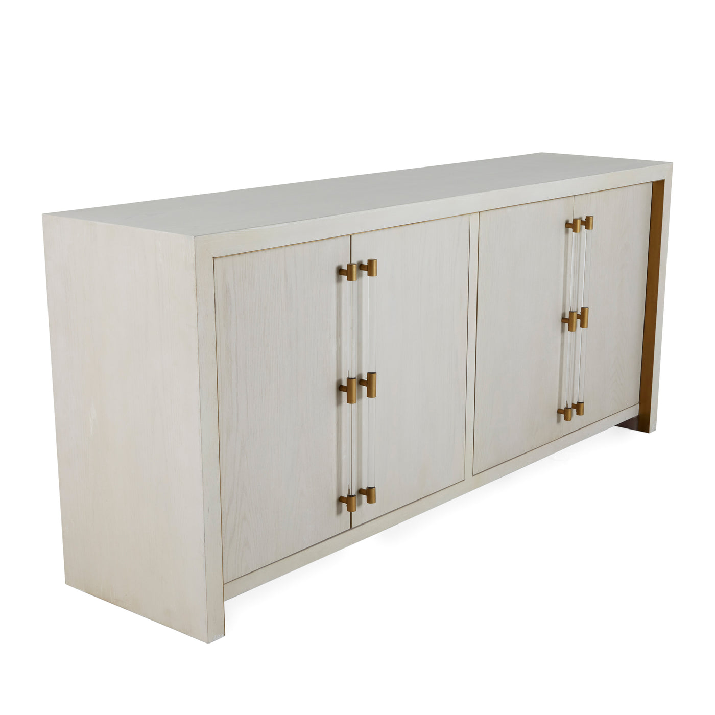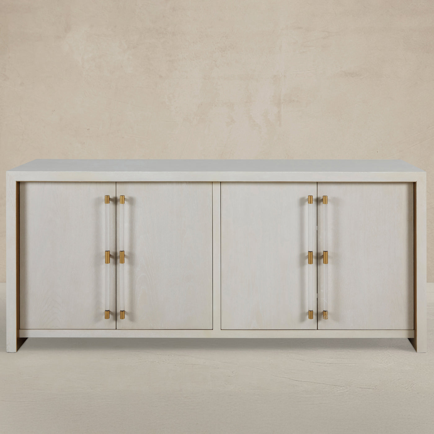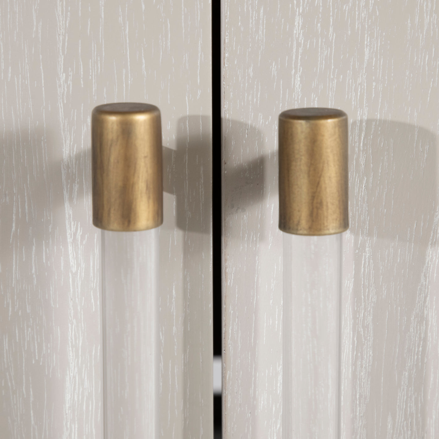The Winford Waterfall Cabinet exudes a contemporary grace, seamlessly merging a white cerused finish with luxurious gold banding that traces its distinctive waterfall silhouette. Acrylic handles, adorned with gold-stained metal, complement its modern doors, offering a hint of opulence. This piece reflects Gabby's mastery of transitional style and how it can complement modern or traditional settings. The cabinet's functionality is as versatile as its design, ideal as an elegant storage solution or as a chic media center with ample space for technology management. Gabby's artisanal approach to design showcases a rich interplay of materials, from the tactile cerused wood to the sleek acrylic and warm metal accents, each element contributing to a layered, sophisticated aesthetic. It's a testament to the brand's ethos of material harmony, ensuring that every piece is not just a furnishing, but a focal point of artistic expression and practical elegance.