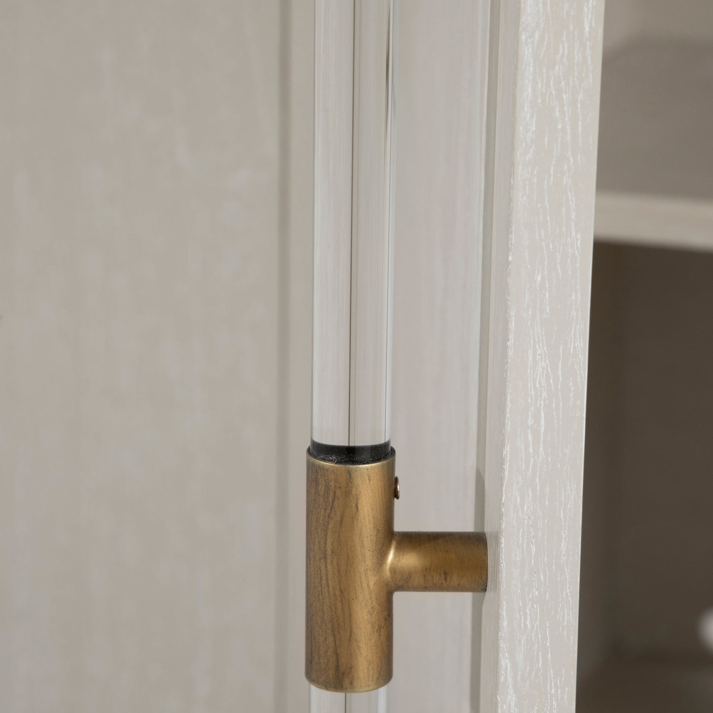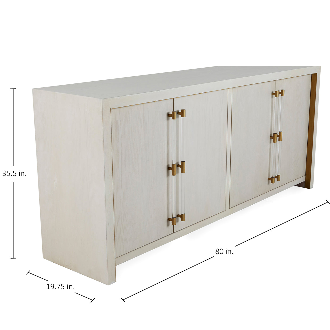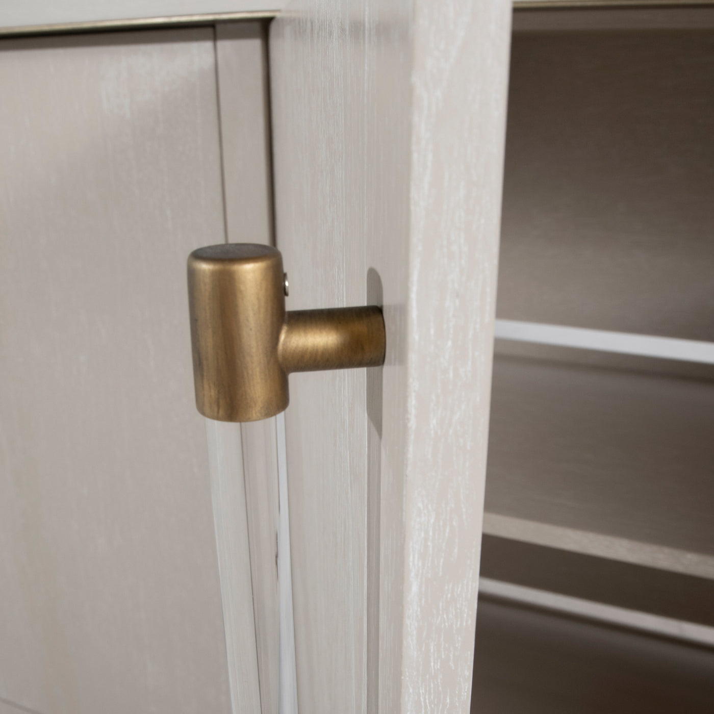 The Winford Waterfall Cabinet exudes a contemporary grace, seamlessly merging a white cerused finish with luxurious gold banding that traces its distinctive waterfall silhouette. Acrylic handles, adorned with gold-stained metal, complement its modern doors, offering a hint of opulence. This piece reflects Gabby's mastery of transitional style and how it can complement modern or traditional settings. The cabinet's functionality is as versatile as its design, ideal as an elegant storage solution or as a chic media center with ample space for technology management. Gabby's artisanal approach to design showcases a rich interplay of materials, from the tactile cerused wood to the sleek acrylic and warm metal accents, each element contributing to a layered, sophisticated aesthetic. It's a testament to the brand's ethos of material harmony, ensuring that every piece is not just a furnishing, but a focal point of artistic expression and practical elegance.
