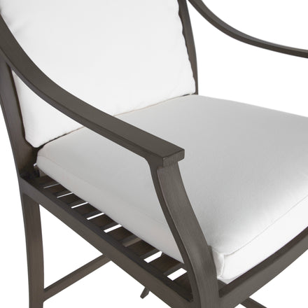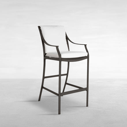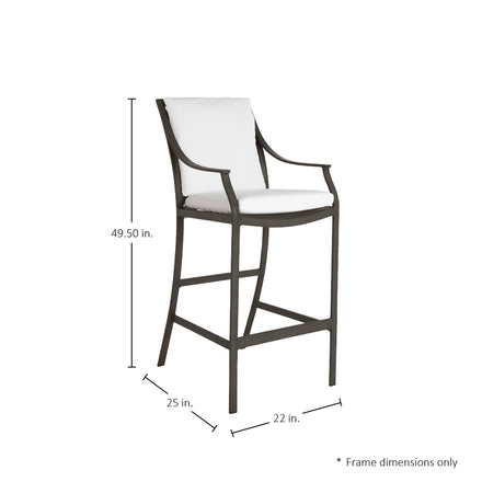 The Monaco Bar Stool elegantly marries modern design with classic touches. Crafted from wrought aluminum with a slim profile, this collection boasts graceful sloping arms and a distinctive X-frame design that creates a timeless look. The triple-layered coating on our wrought aluminum includes powder, dry, and clear polyurethane coats, ensuring resistance to corrosion, fading, and wear, making it perfect for withstanding harsh elements and frequent use. This item is designed to be enjoyed either with or without a cushion. Please designate your choice in the below "Select a Cushion" dropdown.