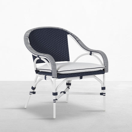 The Savoy Lounge Chair, inspired by French café culture, features durable handwoven N-Dura™ resin wicker on a contrasting wrought aluminum base, offering a chic and sophisticated look with built-in UV resistance to ensure lasting vibrancy. Designed to offer comfort and style, the deep-seated silhouette fits well even in smaller spaces. Whether used to create a memorable social area or as a poolside statement, the Savoy Lounge Chair is a timeless addition that combines enduring style with practical longevity. This item is designed to be enjoyed either with or without a cushion. Please designate your choice in the below "Select a Cushion" dropdown.