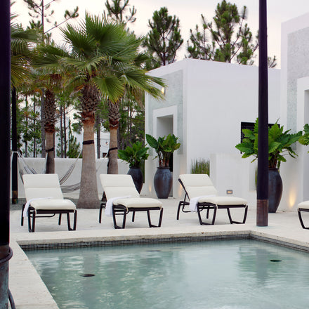 - Adjustable reclining back enhances comfort for lounging in patio or poolside environments
