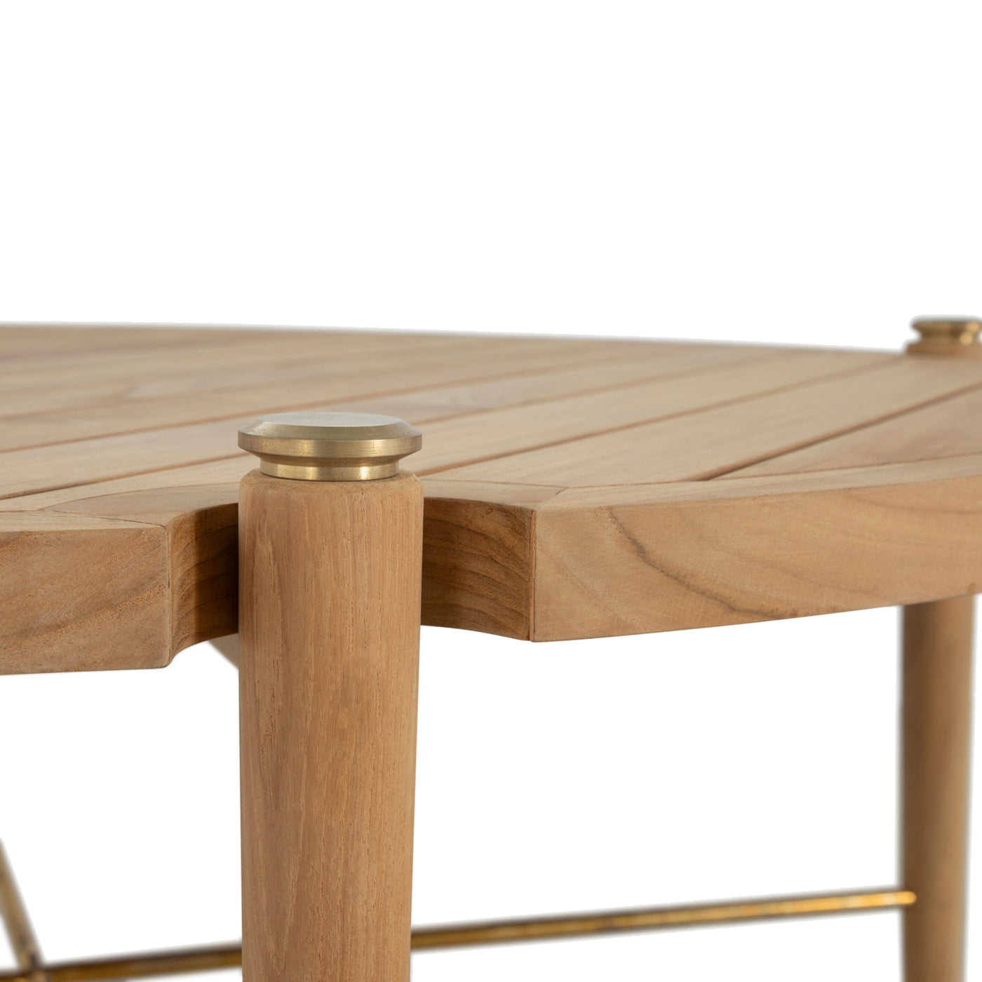 The Pacifica End Round Table enriches outdoor spaces by exemplifying the unmatched elegance and durability of some of the world's finest teak. The unfinished brass accents on the leg extensions add a touch of sophistication, designed to beautifully patina over time, enhancing the tables' aesthetic appeal with a lived-in, vintage charm. The tabletops are thoughtfully slated, promoting efficient water drainage and making them perfectly suited for outdoor environments. Please note, that due to its high-quality center cut, and natural oils, teak will age gracefully without the help of cleaners and protectors.