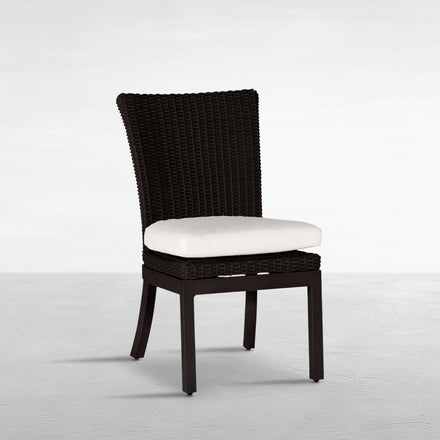 The Rustic Side Chair is a durable and classic addition to any outdoor area, crafted with advanced UV-resistant N-Dura™ resin wicker. This wicker is handwoven over heavy gauge aluminum and features a unique antique finish and braiding detail, ensuring both beauty and longevity. Engineered to withstand extensive UV exposure, the furniture maintains its vibrant appearance and structural integrity for up to five years, outlasting conventional wicker in durability and aesthetic appeal. This item is designed to be enjoyed either with or without a cushion. Please designate your choice in the below "Select a Cushion" dropdown.