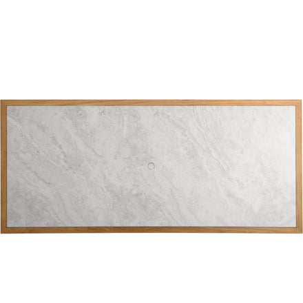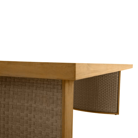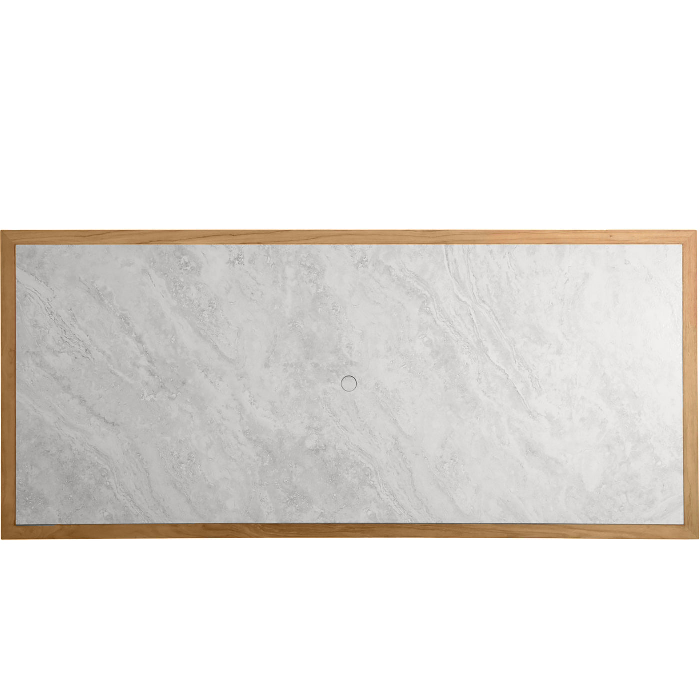 Experience luxury outdoor dining with our Laguna Dining Table, featuring a sleek cream porcelain top, emulating the elegant look of travertine, and natural teak wood base. This porcelain top, celebrated for its hygiene, easy cleaning, and resistance to heat, wear, and scratches, promises long-term color stability and strength against the elements. The table's unique U-shaped legs, tightly woven with high-performance N-Dura™resin, provide ample legroom and add visual interest. At 96 inches, this table comfortably seats ten, ensuring durability and style for gatherings of all sizes.