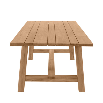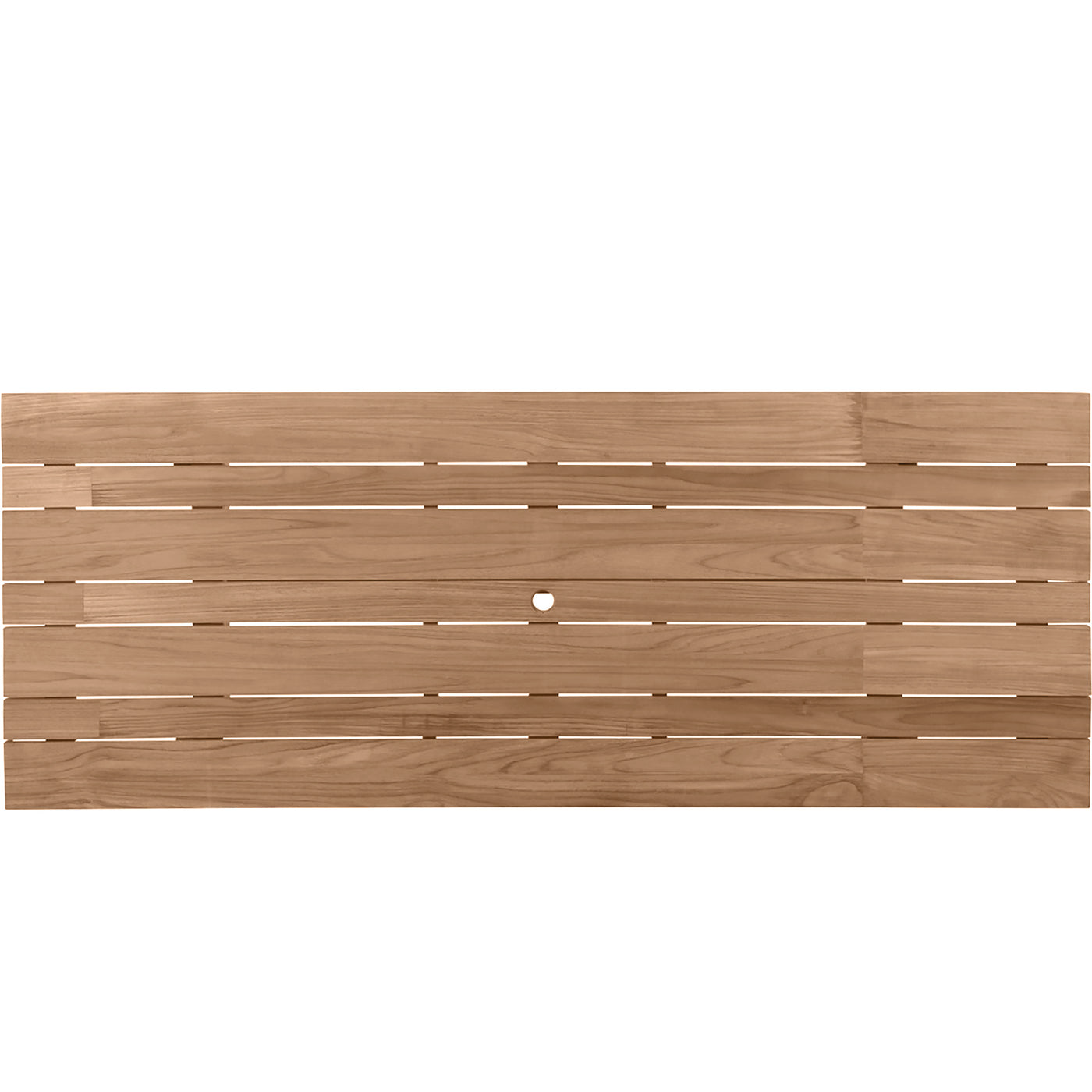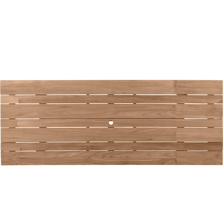 The Paige Teak Rectangular Dining Table features a sleek, modern design with clean lines and a slatted tabletop, crafted from premium Indonesian farm-grown teak known for its durability and weather resistance. The natural oils in the teak make it resistant to water, decay, and insects, ensuring long-lasting use with minimal maintenance. Its sturdy legs and crossbar support provide stability and enhance its aesthetic appeal. This elegant table can comfortably seat eight people, making it perfect for large gatherings and outdoor entertaining. This table also has an umbrella hole in the center of the table that can be used together with one of our Summer Classics umbrellas and bases for added convenience.