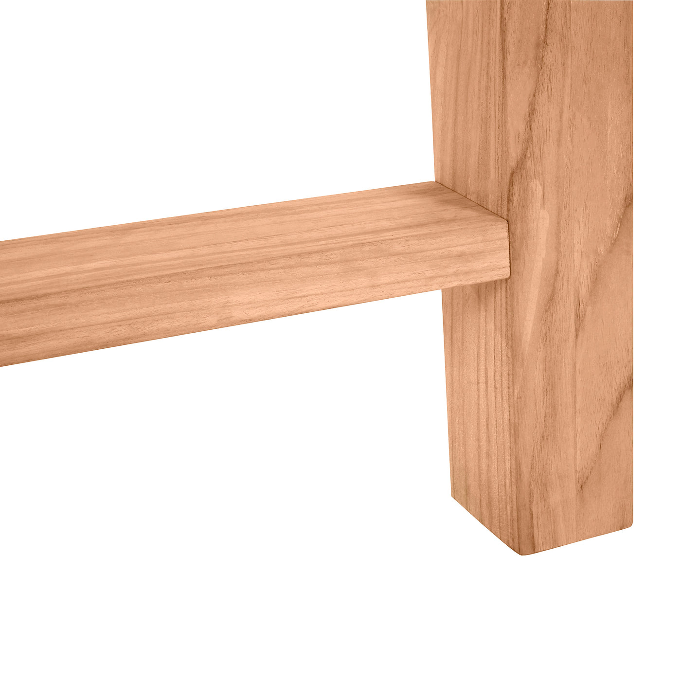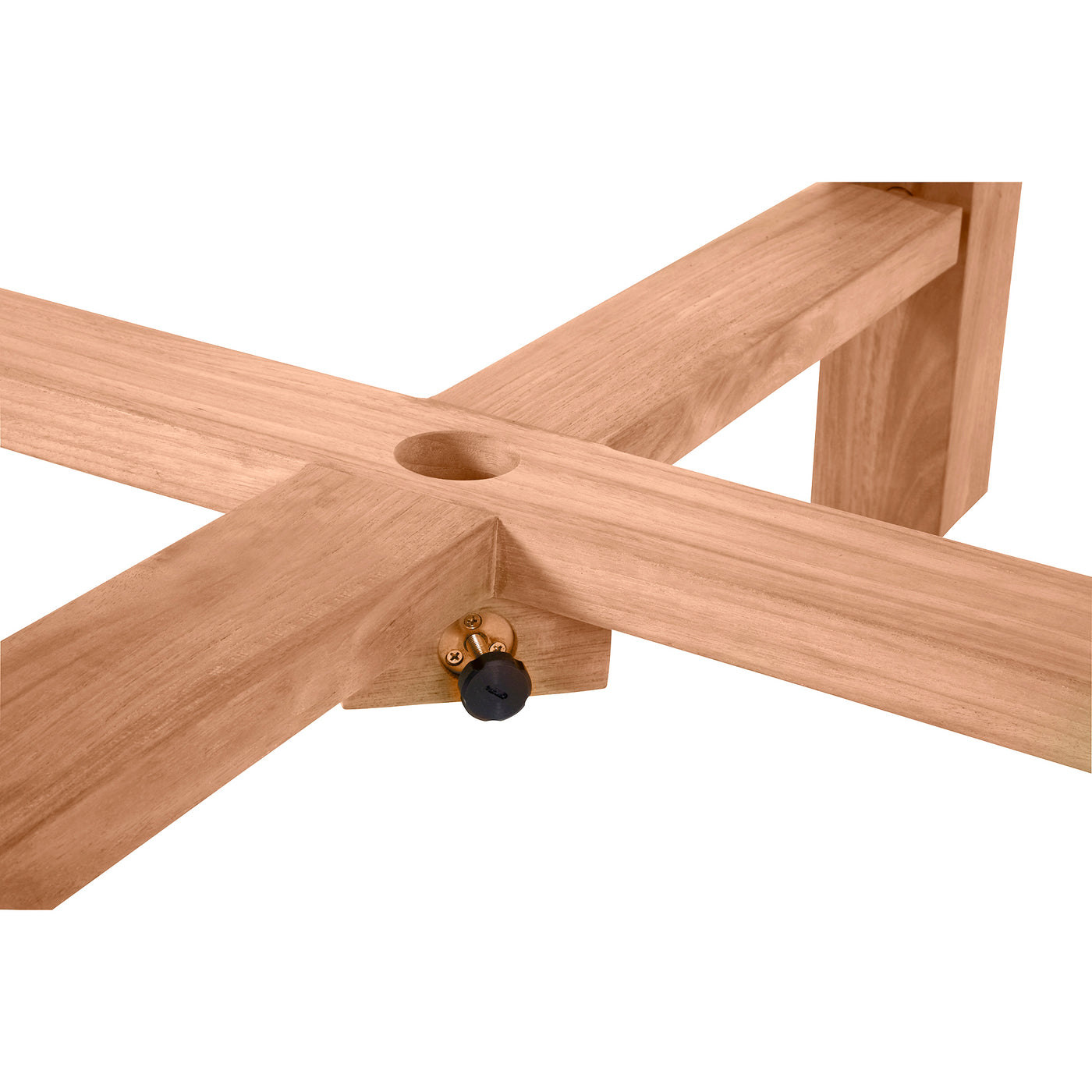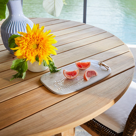 The Paige Teak Round Table features a clean, modern design crafted from premium Indonesian farm-grown teak. This table showcases the natural beauty and durability of the wood, which is known for its resistance to weather, decay, and insects. The slatted tabletop and sturdy cross-leg support offer both aesthetic appeal and stability. This versatile table can comfortably seat 6 to 8 people, making it perfect for outdoor dining and entertaining. This table also has an umbrella hole in the center of the table that can be used together with one of our Summer Classics umbrellas and bases for added convenience.