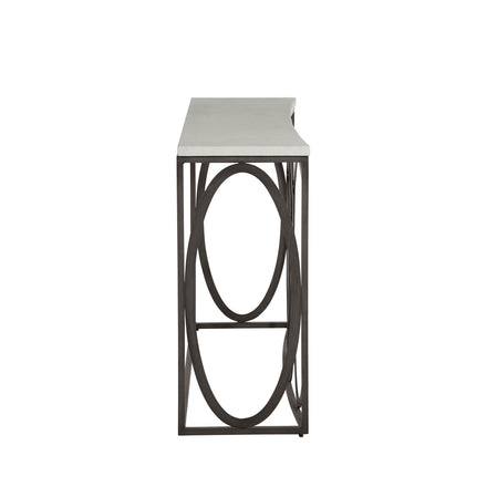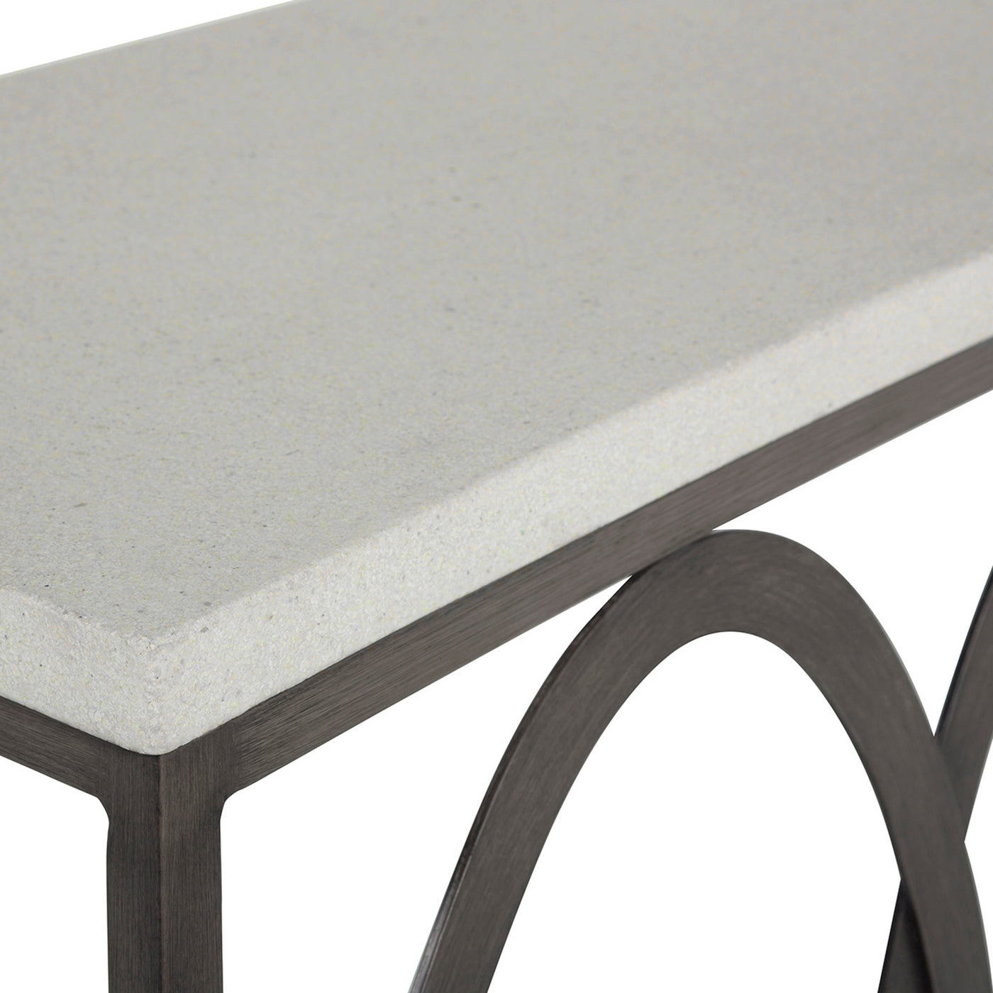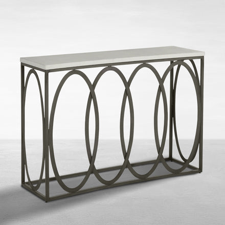 The Ella Console features a base of interlocking aluminum ovals and a Superstone composite tabletop for a sophisticated accent in any outdoor room.