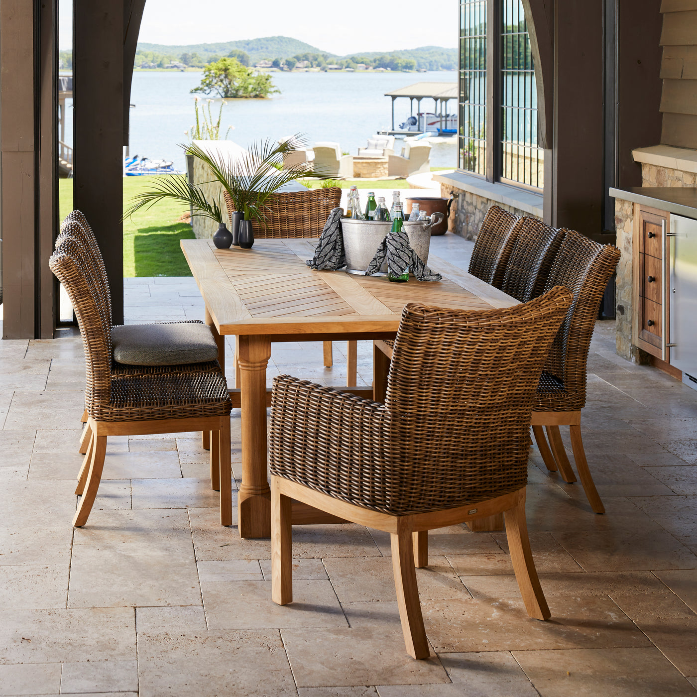 - Multi-tonal large-wicker weave adds rich texture and relaxed charm to outdoor dining spaces