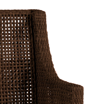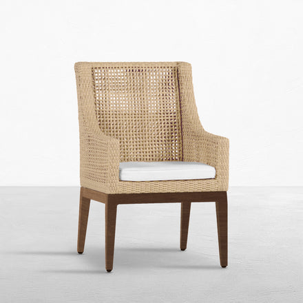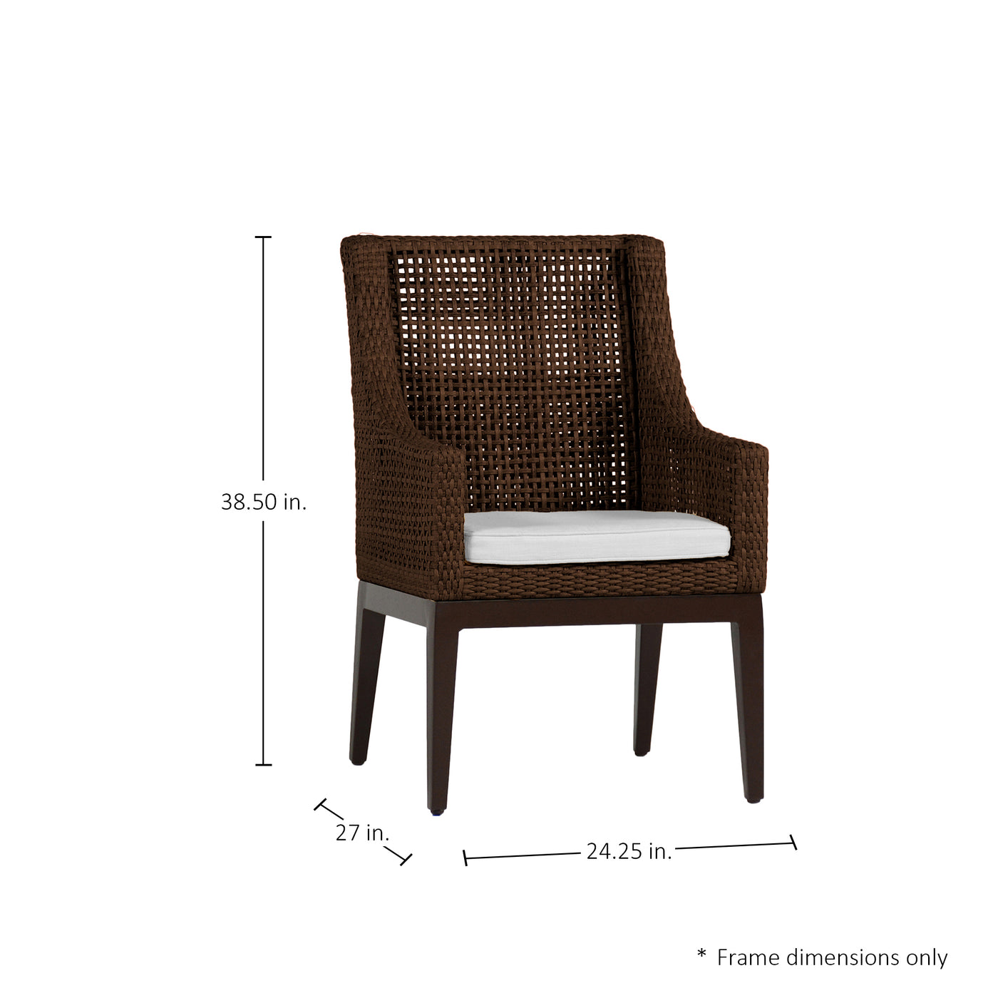 The Peninsula Woven Arm Chair, with its meticulous craftsmanship and sturdy design, offers a touch of timeless elegance. Made from our robust, handwoven N-Dura™ resin wicker, this chair is not only stylish but built to last. Its open weave provides a light and sophisticated look, perfect for creating an inviting outdoor dining area or a standalone statement piece in your garden or on your patio. This chair's material is engineered for longevity, featuring UV resistance integrated within the wicker to prevent fading and maintain structural integrity. Tested rigorously, the wicker is proven to withstand extensive UV exposure, guaranteeing that the chair retains its beauty for approximately five years of realistic use. This item is designed to be enjoyed either with or without a cushion. Please designate your choice in the below "Select a Cushion" dropdown.
