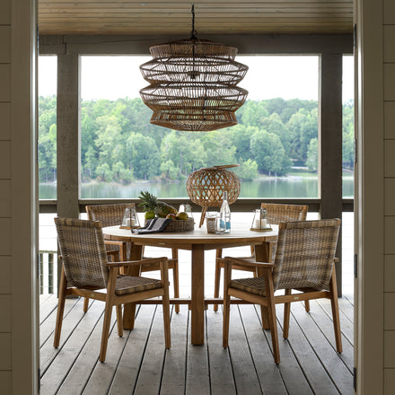 Discover the Pointe Dining Arm Chair, a testament to the Pointe Collection's fusion of mid-century elegance and modern practicality. Constructed from Indonesian Teak, known for its natural oils and dense grain, this chair ensures lasting beauty and performance in outdoor settings. Its N-Duraâ„¢Resin Wicker seat provides a comfortable embrace, allowing for enjoyment with or without an additional cushion. As it ages, the teak frame will gracefully transition to a sophisticated silver patina, adding unique character while maintaining simplicity in care. As an integral piece of a chic dining ensemble, the Pointe Dining Arm Chair enhances alfresco dining experiences with its versatile design, suitable with or without a seat cushion.