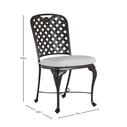 The styling of the Provance Side Chair evokes the relaxed elegance of the South of France. The chair features a double latticework design, scooped high back, and never-rust cast aluminum construction that is finished in an architectural-grade powder coating that is exceptionally weather resistant. This gracefully styled side chair mixes well with a variety of outdoor settings. This item is designed to be enjoyed either with or without a cushion. Please designate your choice in the below "Select a Cushion" dropdown.