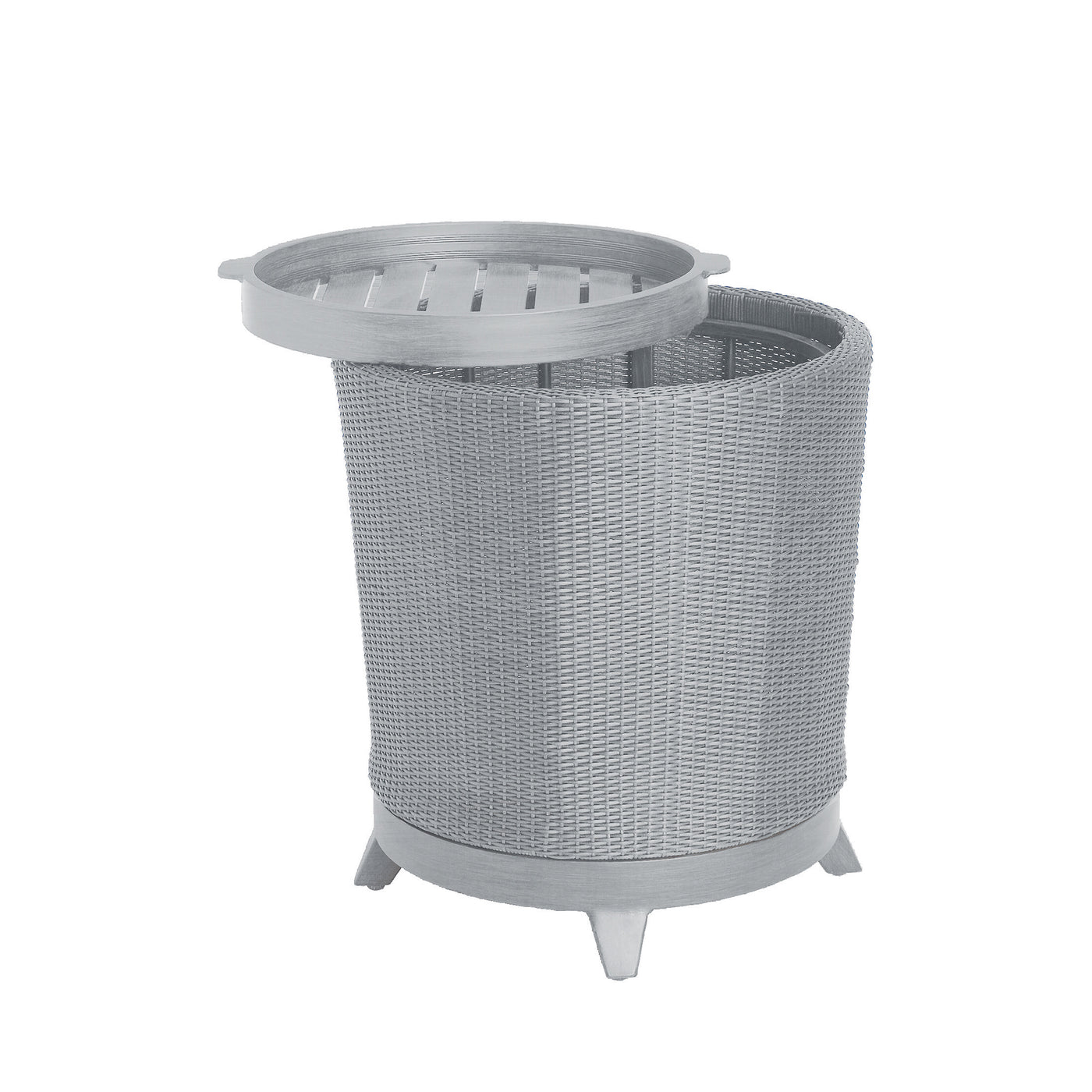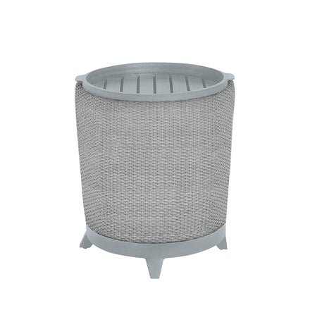 Introduce elegance and utility to your outdoor space with the Halo/Detron Round End Table in Oyster. This chic table combines the durability of N-Dura™ resin wicker with the strength of a wrought aluminum frame, offering a stylish solution to outdoor decor. Its innovative design features a removable tray top, seamlessly blending functionality with aesthetic appeal. The slatted tray ensures water drainage, making it perfect for poolside or patio settings. Ideal for serving, storage, or simply as a complement to your outdoor furniture ensemble, this versatile piece in a serene Oyster hue adds a touch of sophistication while promising longevity and ease of maintenance. Perfect for those seeking to enhance their outdoor living areas with functional elegance.