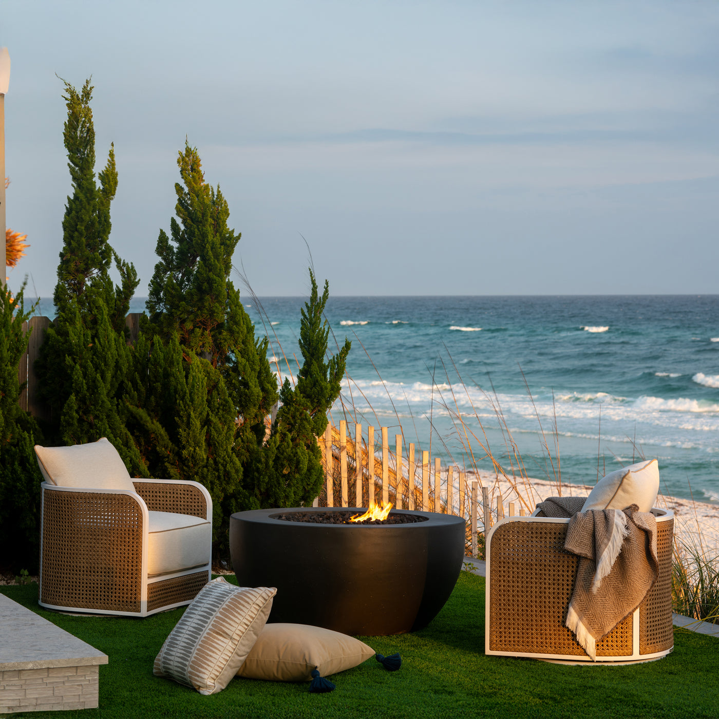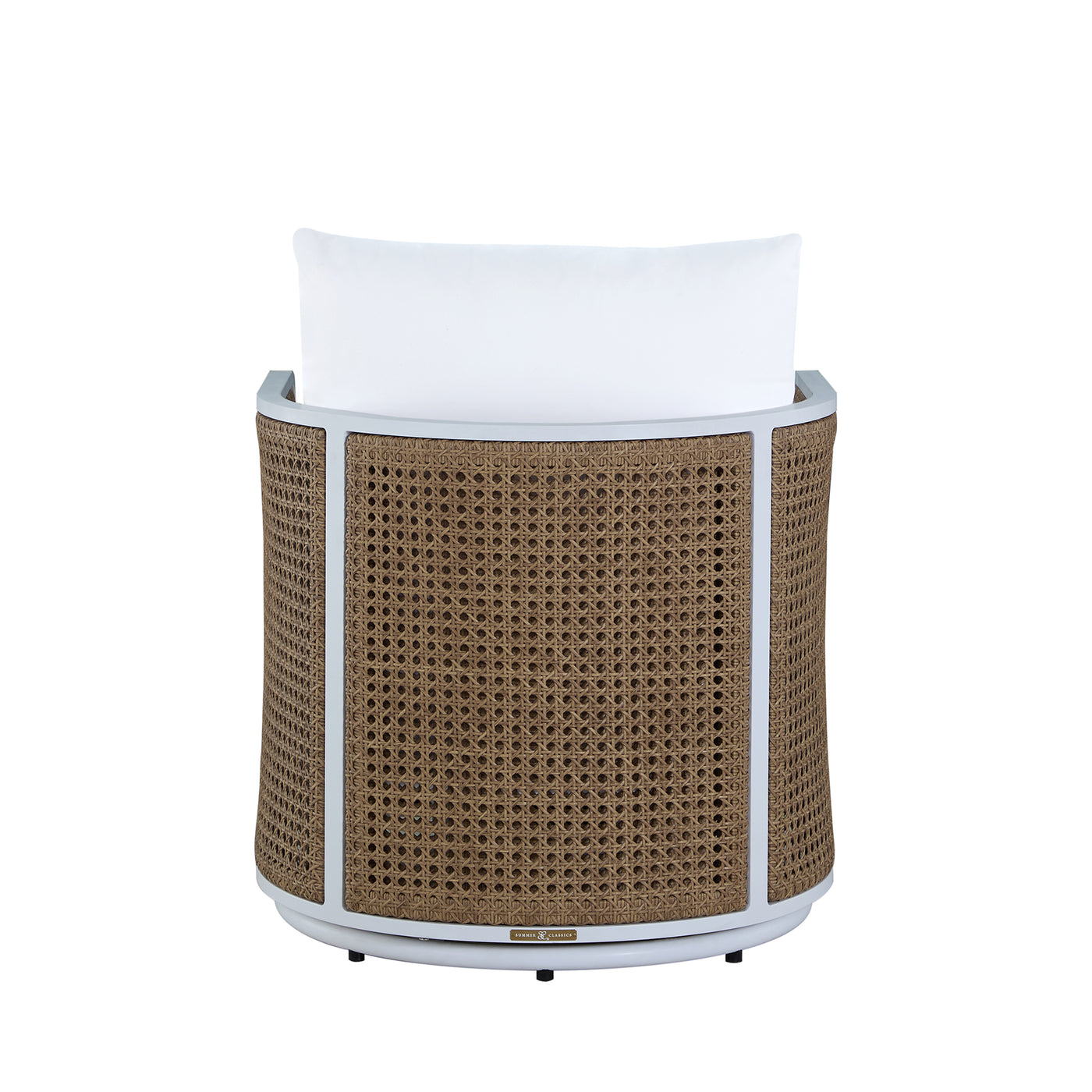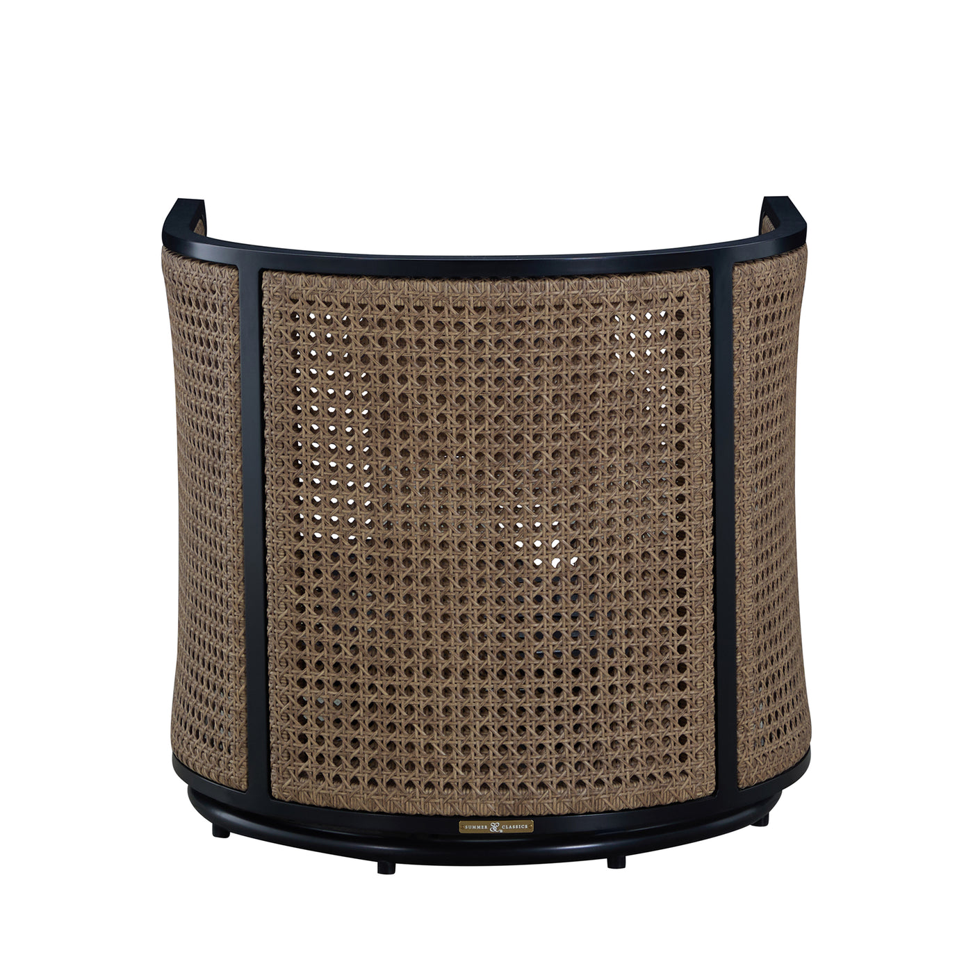 The Havana Swivel Lounge brings motion and comfort to the collection’s signature blend of nostalgic charm and modern craftsmanship. Featuring handwoven, all-weather N-Dura™ resin wicker in a classic open cane pattern, it pays tribute to traditional Cuban design while offering exceptional outdoor durability. Set within a sleek, powder-coated aluminum frame with gently rounded corners and mid-century modern cues, this lounge chair rotates smoothly 360 degrees—perfect for relaxed entertaining and conversation. With its plush cushions and rich texture, the Havana Swivel Lounge delivers timeless style with contemporary comfort for any outdoor retreat.