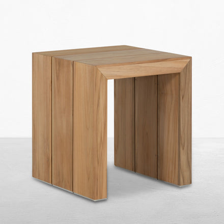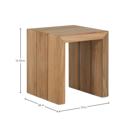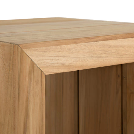 Our Messina Side Table is a contemporary masterpiece crafted from sustainably harvested teak. This table features a unique chunky waterfall design, with seamlessly aligned panels that extend to the ground. Despite its solid appearance, it's ingeniously hollowed to reduce weight, enhancing versatility without sacrificing style. Perfect for complementing various collections, its natural durability and elegant design offer timeless appeal and practicality for any outdoor space. Please note, that due to its high-quality center cut, and natural oils, teak will age gracefully without the help of cleaners and protectors.