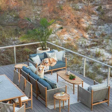 The Pacifica Round Coffee Table enriches outdoor spaces by exemplifying the unmatched elegance and durability of some of the world's finest teak. The unfinished brass accents on the leg extensions add a touch of sophistication, designed to beautifully patina over time, enhancing the tables' aesthetic appeal with a lived-in, vintage charm. The tabletops are thoughtfully slated, promoting efficient water drainage and making them perfectly suited for outdoor environments. Please note, that due to its high-quality center cut, and natural oils, teak will age gracefully without the help of cleaners and protectors.